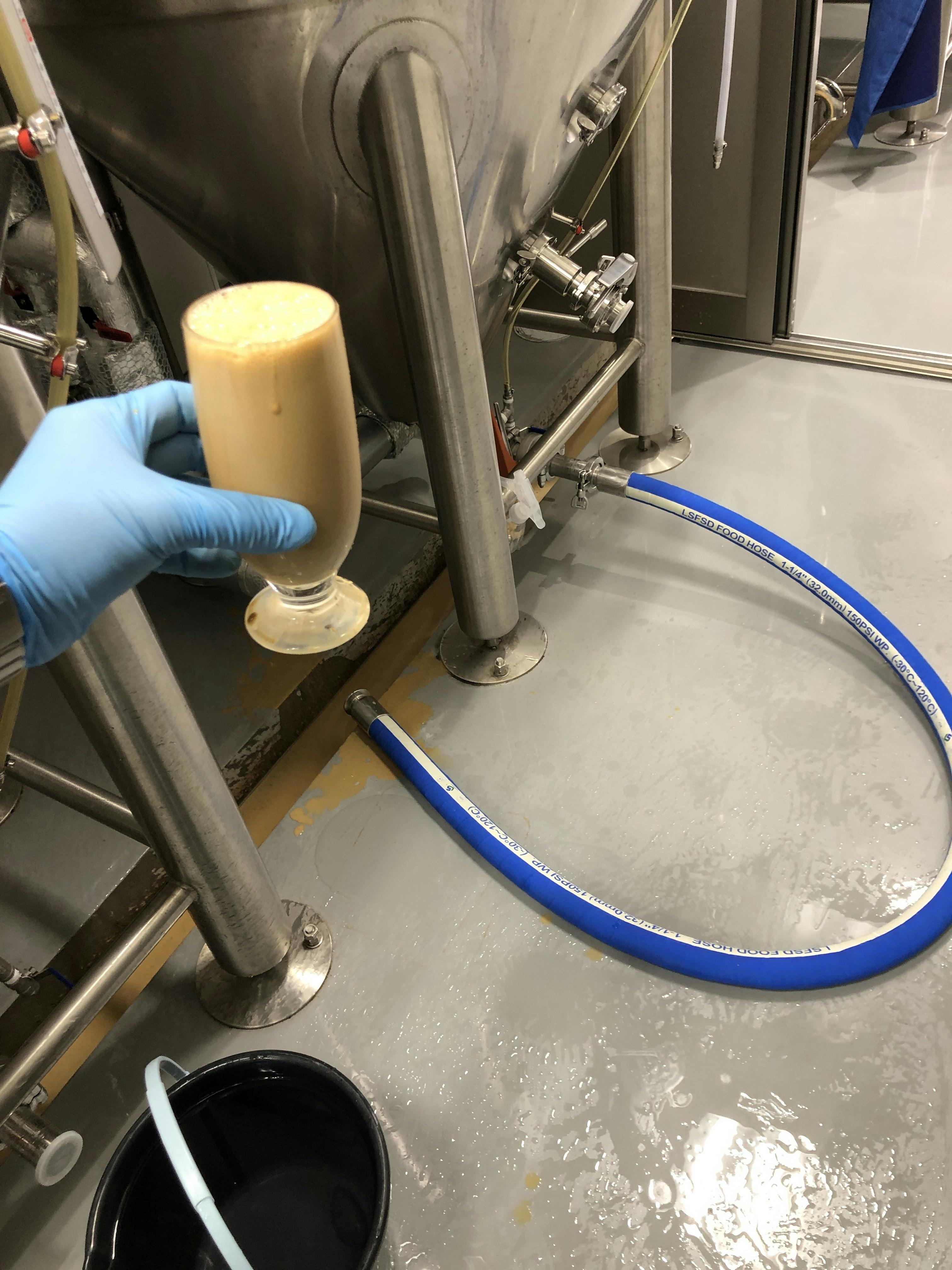 一次発酵が終わり、タンク内の温度を下げると、酵母が下に沈んでいきます。早めに抜くの大切。1回目2回目はふわふわのソフトクリーム状の酵母で抜けますが最後はサラッとしたオリとして抜けてきます。ちゃんと抜かないと酵母臭いビールになることも…。