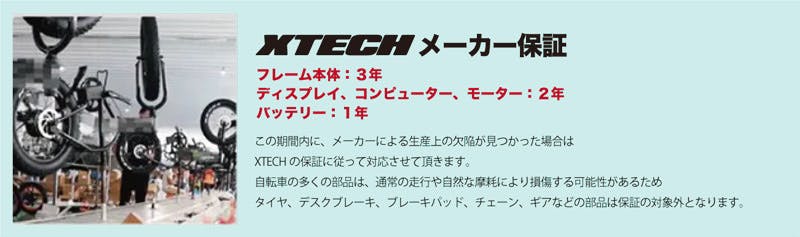 A. XTECH FATBOYは「フレーム本体3年」「ディスプレイ・コンピューター・モーター2年」「バッテリー1年」のメーカー保証が付いています。この期間内に、メーカーによる生産上の欠陥が見つかった場合は、当社の保証に従って対応させていただきます。自転車の多くの部品は、通常の走行や自然な摩耗により損傷する可能性があるため、タイヤ、ディスクブレーキ、チェーン、ブレーキパッドなどの部品は保証の対象外となります。弊社のカスタマーサービス部門にお問い合わせください。