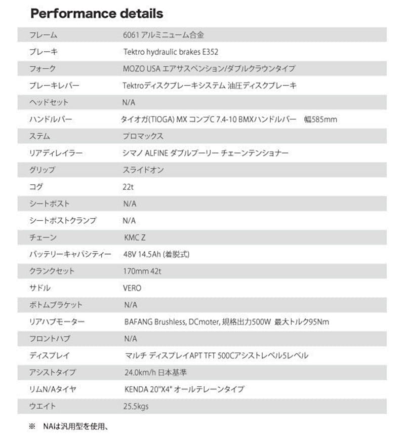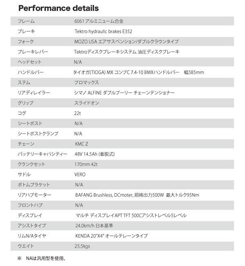 世界シェアNo.1 のBafangモーターは、パワフルなパフォーマンスを発揮します。バッテリーやコントロールシステムをフレーム中心に配置した低重心が特徴です。タイヤはKENDA製 20インチX 4インチのオールテレーンタイプを装着しています。