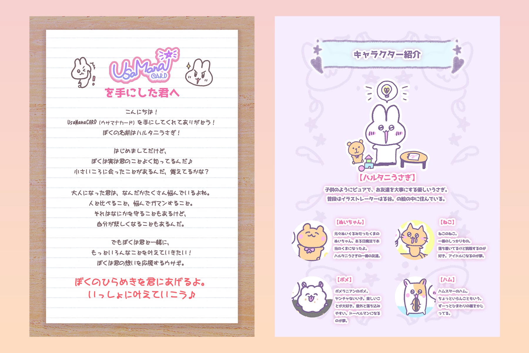 UsaManaCRADのイラストは、ハルタニうさぎとそのお友達との物語を通して描かれています。