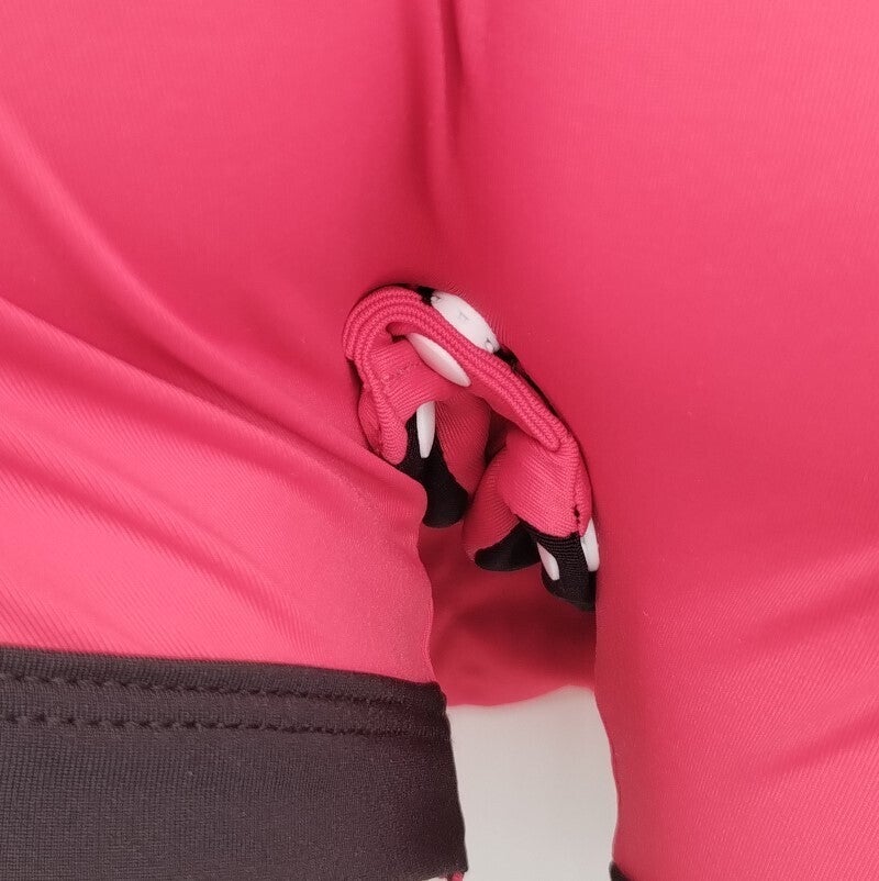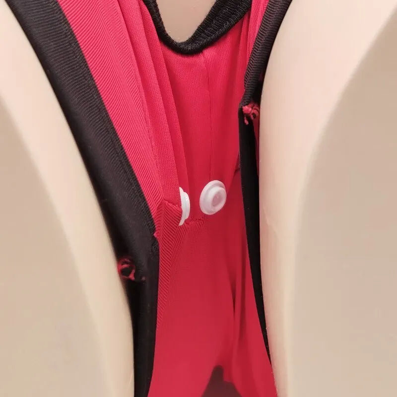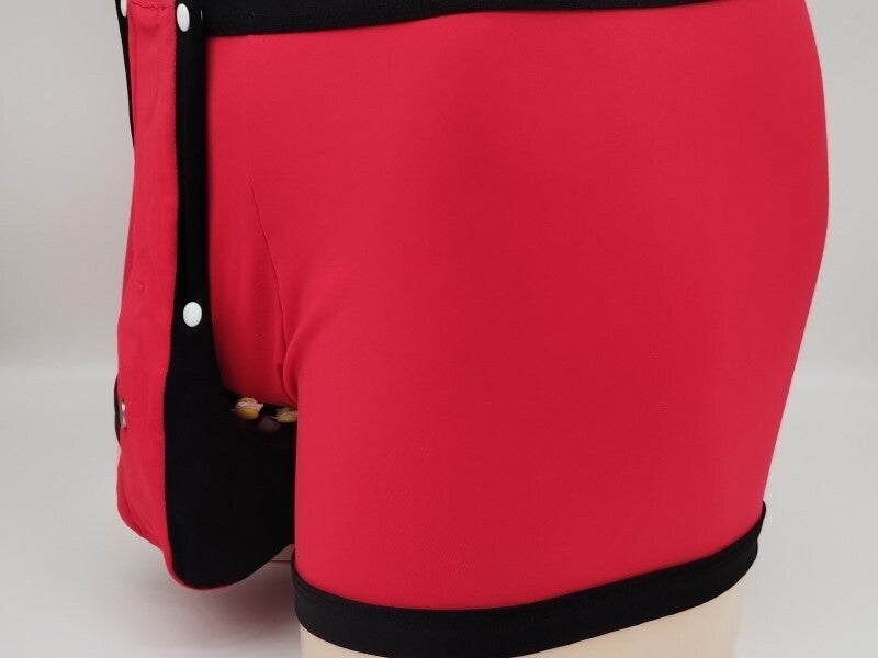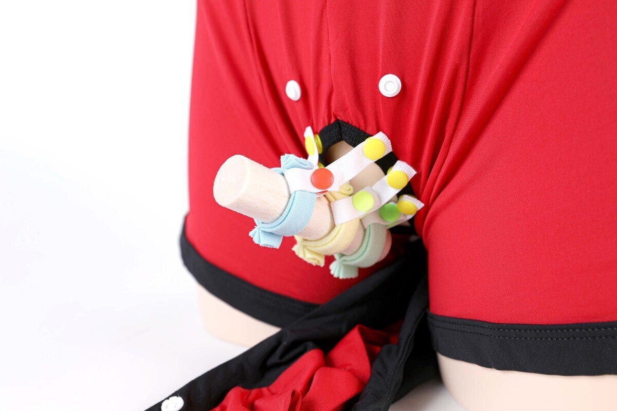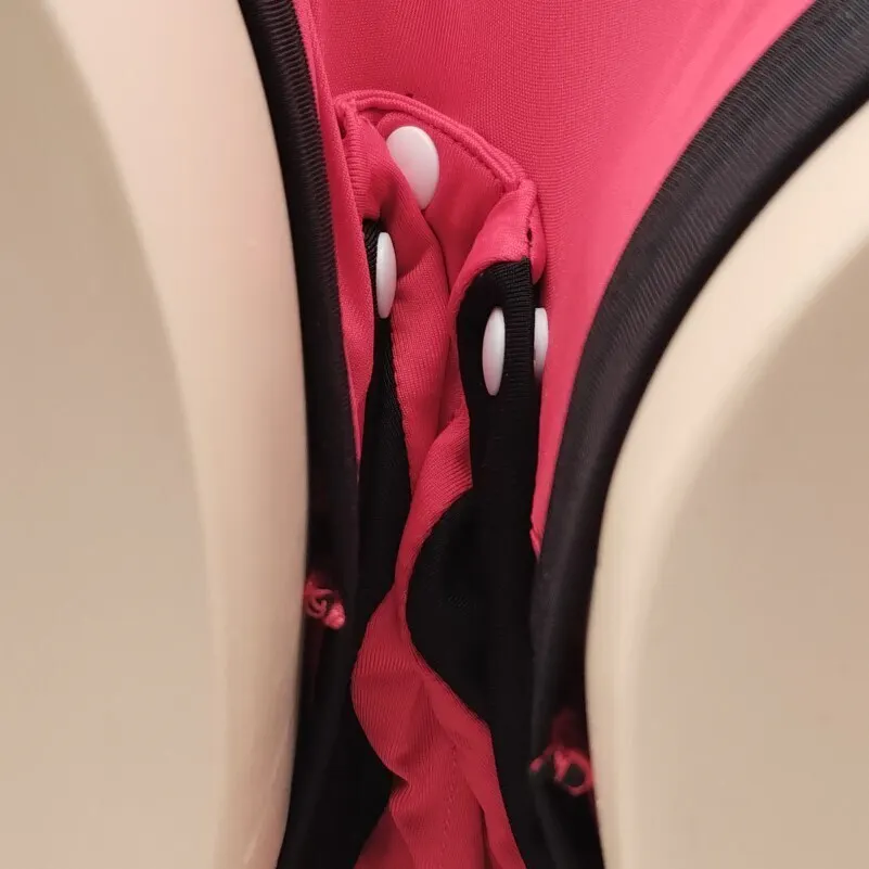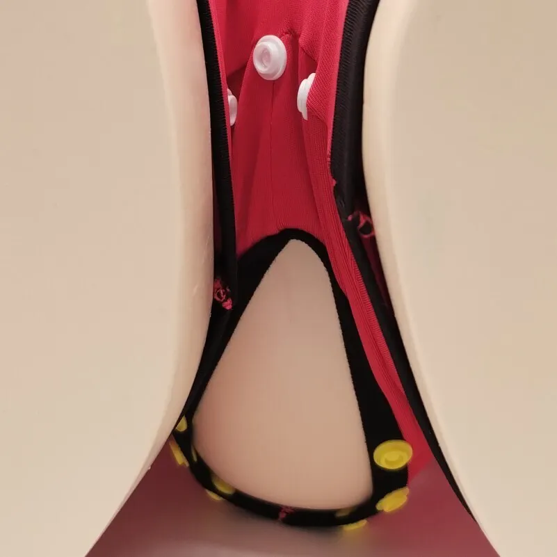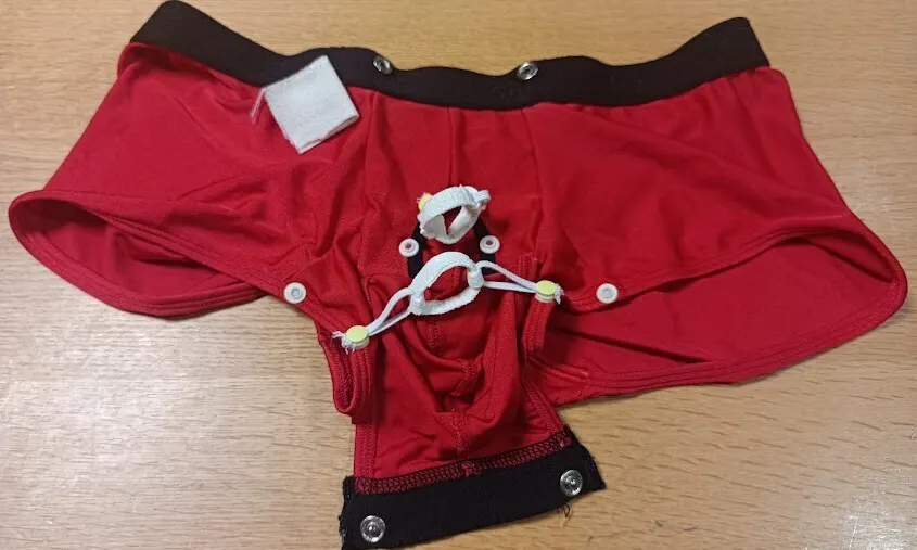④陰嚢を穴から出し、下着を腰の位置まで上げ、カバーの白いボタンを下着本体に取り付けて完了です。