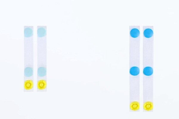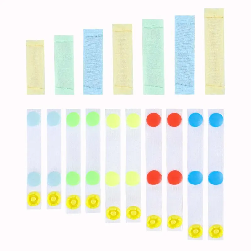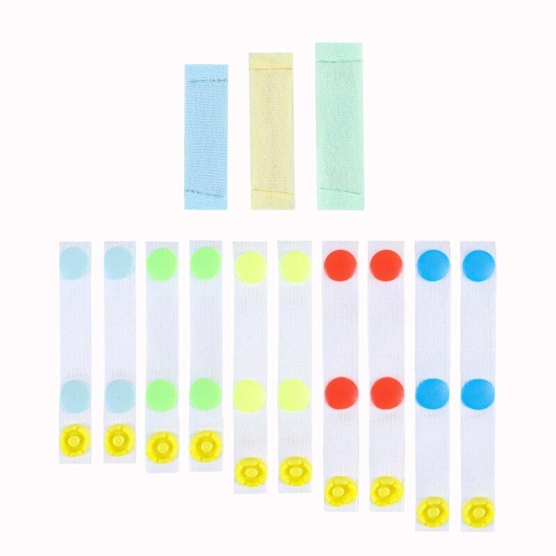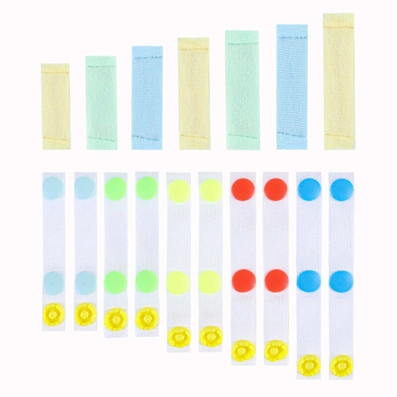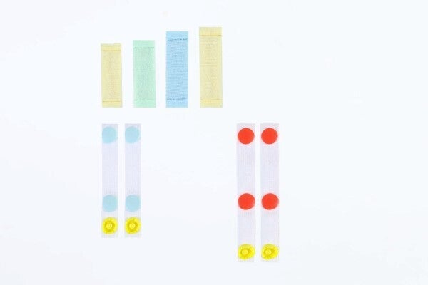 できるだけ着用説明書を見ないで着用できるように色分けしています。リングは径違いを3色毎に、ストラップは長さ違いを2つのボタンで表現し、ボタン同士を留める所を同色に(カバーは白色、ストラップと本体は黄色のボタンで)揃えています。種類が多い分、カバーの内側がカラフルになってしまいましたが、ご容赦下さい。