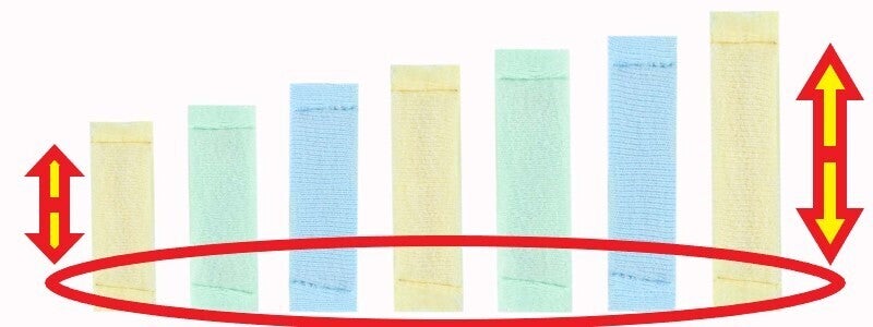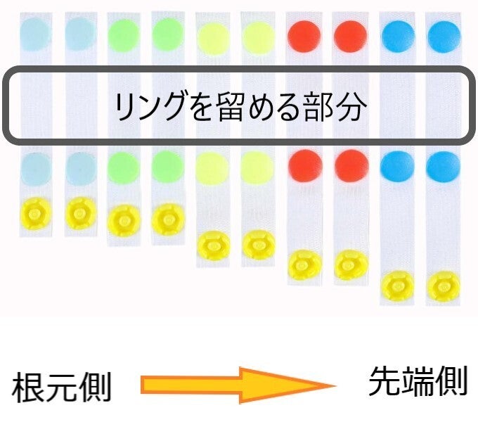 リングは斜めに縫っています。3色で長さ違いが見分けられるようにしています。