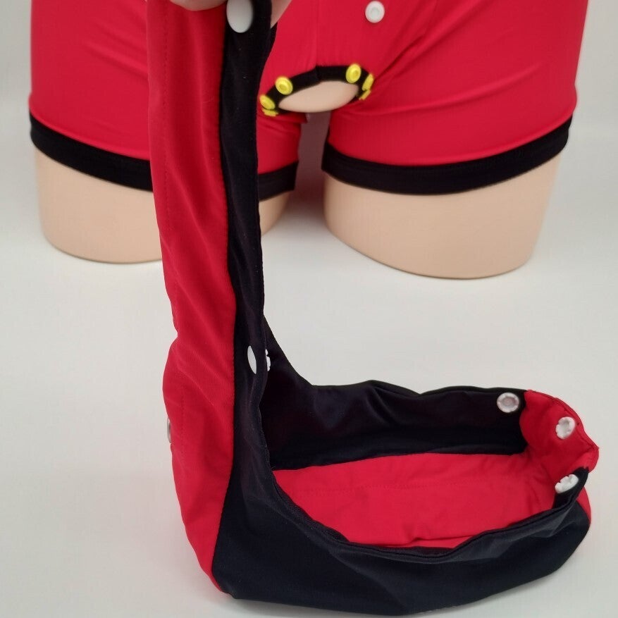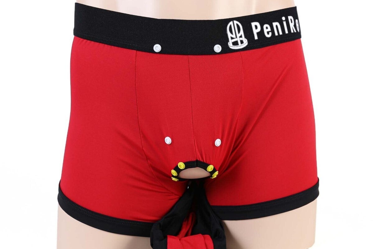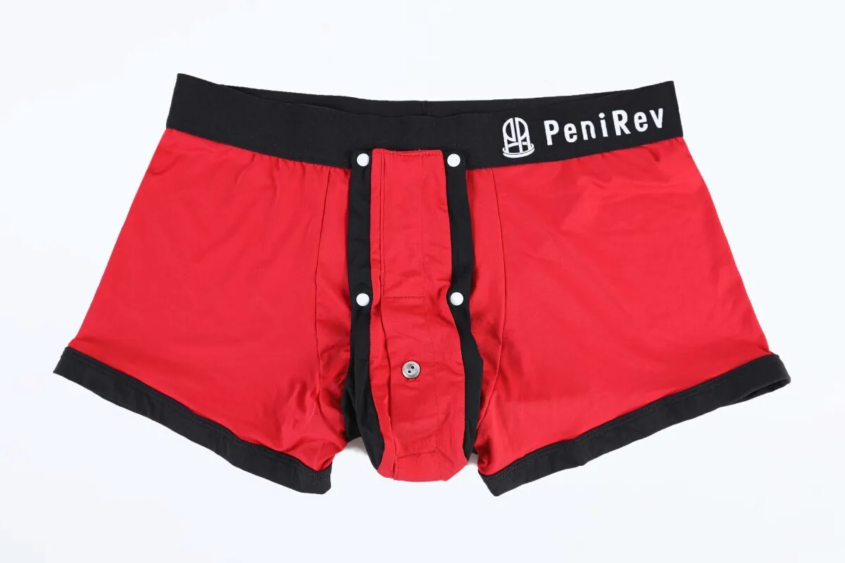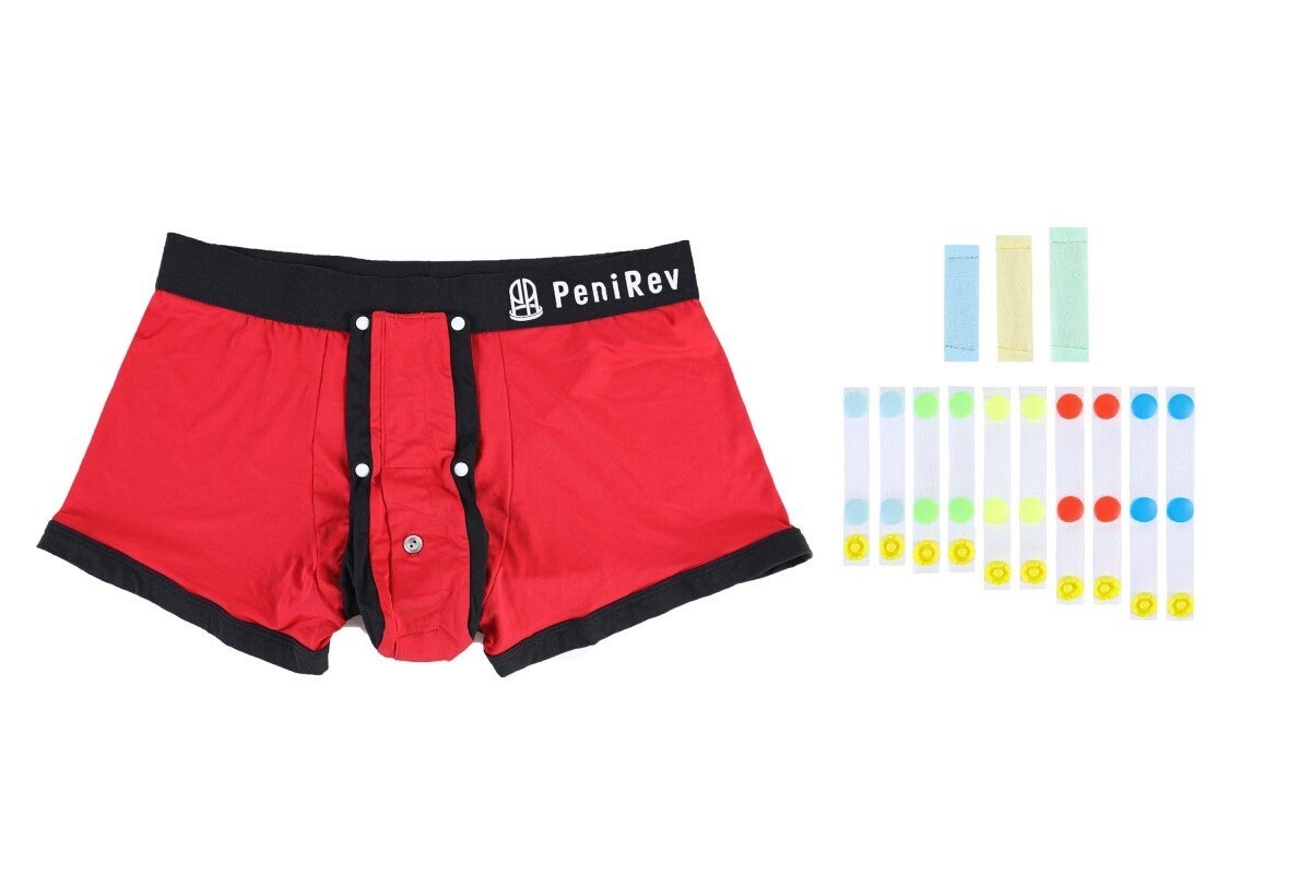 この男性用下着ペニレブは包茎矯正、包茎改善目的の男性用機能下着で、形状としてはボクサートランクスとでも呼ぶべき新しい形になります。(陰茎と陰嚢は中心部の穴から出して、カバーを留めます。)陰茎と陰嚢を圧迫しないようにゆったりしたカバーが付属しています。カバーは脱着可能です。