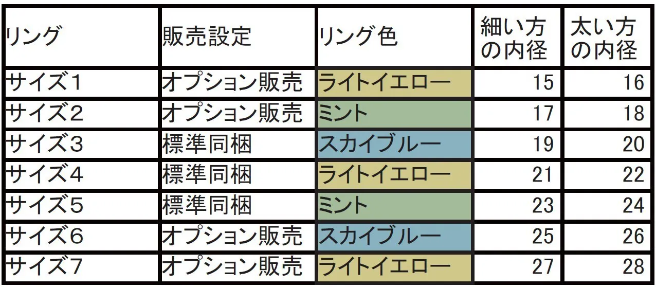 直径で2mm(目安)毎にオプション含めて7つのサイズを準備すると共に、リングはテーパー状になるように、根元側(装着時の入口)と先端側(出口)側で1mm(目安)先端側が細くなるように縫製しています。標準セットでは、内径19mmから24mm、オプションセットでは、内径15mmから28mmを1mm間隔でカバーしており、できるだけ多くの人に合うようにリングを揃えました。ニット製のリング自体は伸縮しますので、無理に小さい径を装着しない限りは締め付けられて痛いと感じることは無いと考えています。痛いと感じるようでしたら、1つ大きい径のリングに交換して下さい。