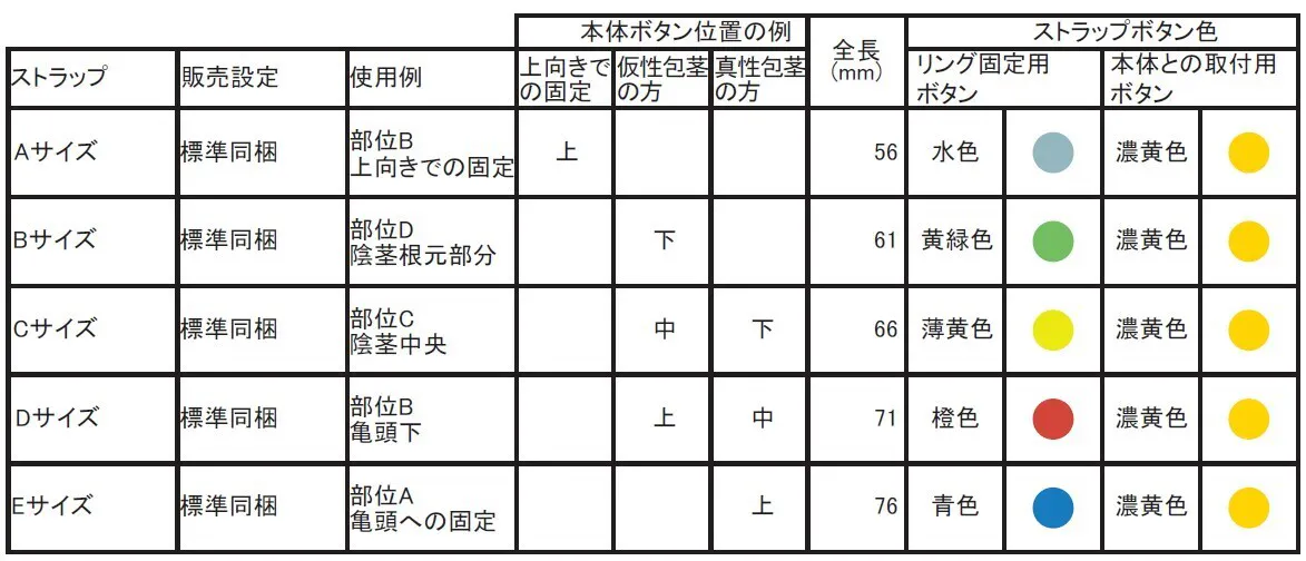 A:リングを装着したい位置で着用して、ストラップが弛んでいるなら短めのストラップに交換、リングがすぐに根元方向にズレるようなら、長めのストラップに交換して下さい。それでも長さが合わない場合は、naknohito@penirev.comにご連絡下さい。