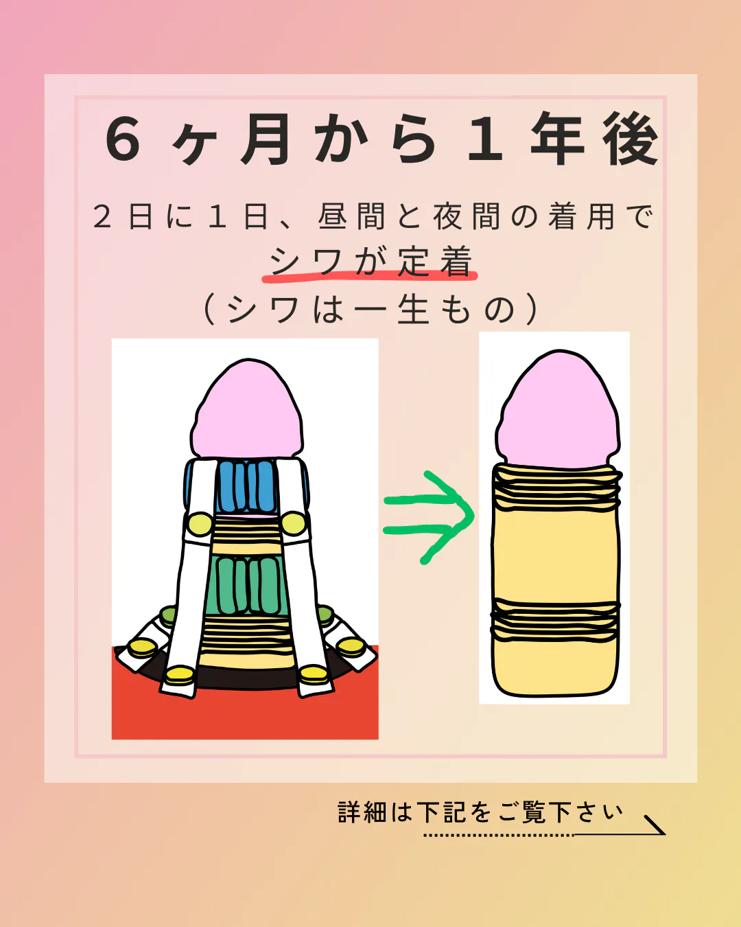 しかしながら、複数のリングを同時に装着し、毎日就寝時(勃起時)に継続して着用することで、真性包茎から、仮性包茎に移行する方もいると期待しております。長期間着用して頂いた方から、フィードバックを頂けるとありがたいです。真性包茎の方向けの亀頭用の専用リングの開発に活かしたいと考えております。