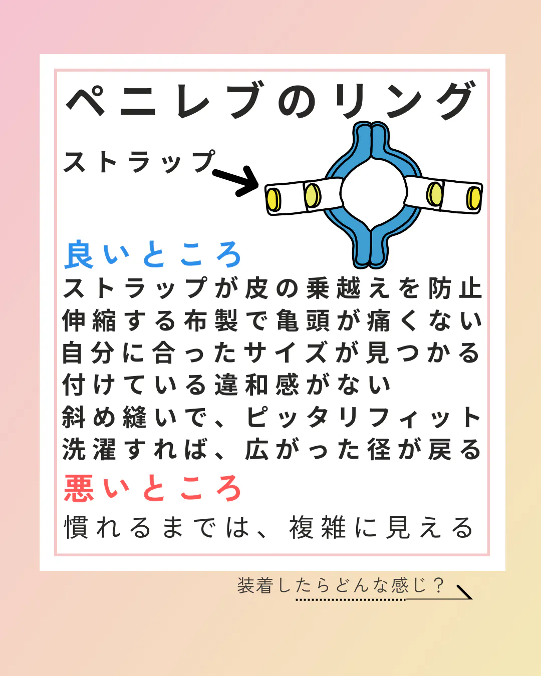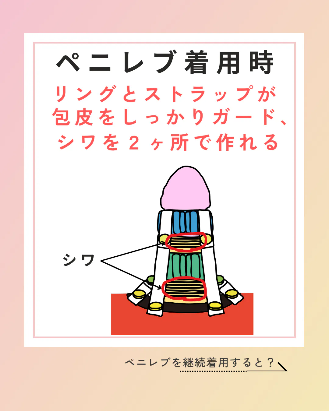 20年以上の経験を踏まえ、下着と繋がるストラップにより、包皮がリングを乗り越えることを抑制しました。リングが陰茎から外れるようでしたら、径を1つ小さいリングに交換して下さい。また、リングを複数装着できるようにし、陰茎の根元側の包皮にもシワ(剥き癖)を作りやすくしています。詳細はペニレブウェブサイト(着用効果)でご確認お願い致します。