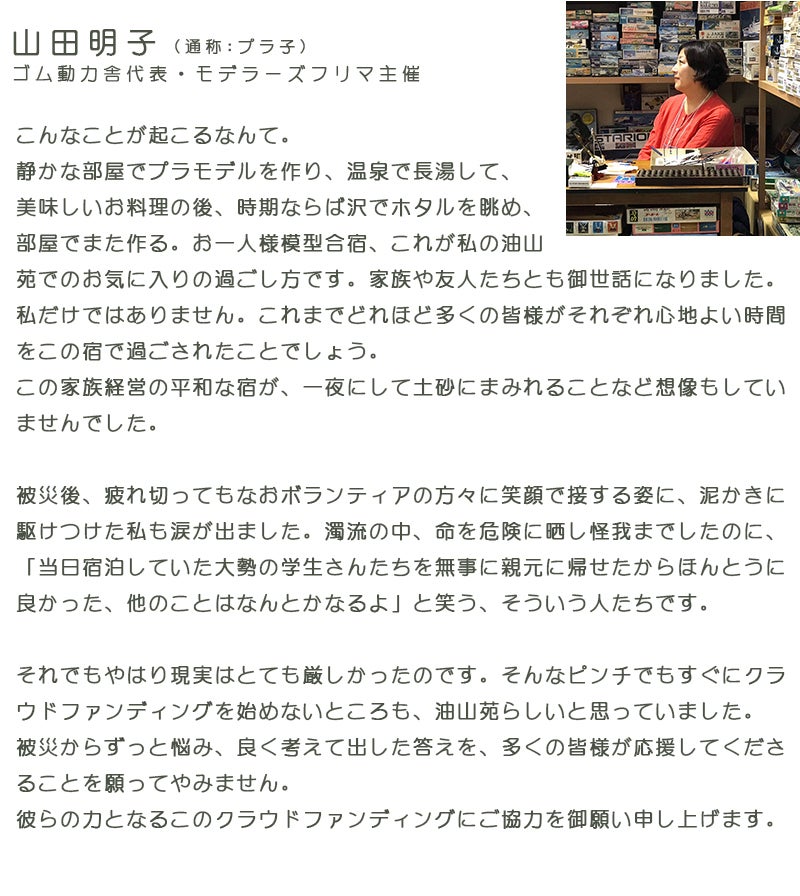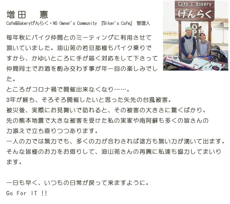 リターン品のご紹介です。≪わさびの門前のわさび≫【わさびの門前のわさびセットコース】お送りするのは「わさびの門前」さんの本わさび2本と、わさびのお漬物の詰め合わせセット。静岡市葵区有東木。標高600m、山からの澄んだ豊富な水で育つ有東木のわさびはかの徳川家康公が好み、長い間門外不出とされていたとか。その有東木にある「わさびの門前」さんは17代目400年の歴史あるわさび農家。油山苑も門前さんのわさびを使わせていただいています。油山苑の夕食 お刺身に沿えて。おろしたてのわさびは爽やかな香りと、どこかほんのりとした甘みを感じられます。油山苑の朝食でもお出ししておりました、オクシズの「わさび飯」。元々はわさび農家さんのまかない飯でした。あつあつごはんに鰹節とわさびをお好きなだけのっけて、お醤油もお好みの量で豪快に召し上がってみてください。※お送りするのは本わさびとわさびのお漬物のみ。本わさびの扱い方は、出来るだけ細かい目のおろし器で、茎を取った所から円を描く様に優しくすりおろしていきます。専用のおろし金でなくても大丈夫。 保存方法は、使用したところをよく洗ってから、キッチンペーパーなどで拭いて水気をとり、ラップでくるんで野菜室に入れて保存、これで1ヶ月~1ヶ月半大丈夫です。同じく台風15号の被害でわさび生産量が減っている状況のなか、返礼品のご協力をいただけることになりました。この機会にぜひご家庭でもご賞味いただけましたらうれしいです。本日、クラウドファンディングページ本文に、ネクストゴールについて追記いたしました。※ネクストゴールとは、プロジェクトの目標金額を達成した場合に追加で設定される、第2の目標金額です。目標金額の達成はみなさまのご支援とご協力のおかげです。心から感謝申し上げます。 プロジェクト終了日は6月14日(水)となります。最終日まで旅館再開のために頑張らせてください。