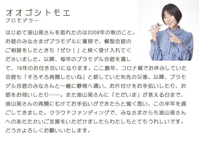 *****************************************プロモデラーとしてご活躍中のオオゴシトモエさんから応援メッセージをいただきました。オオゴシトモエさんは油山苑で毎年6月に模型合宿を開催。弊宿とのお付き合いも15年になります。プラモデルの楽しさをひろめたいと、お子さんたちや学生さんから、シニア世代の方々まで、幅広い年代の模型教室で講師をつとめておられます。模型関連の書籍も多数出版。「これからプラモデルをはじめたい」という方へむけて、優しい語り口でプラモデルの作り方を解説されています。まさにプラモデルのナビゲーター。模型合宿もまた再開していただけるように、営業再開にむけて頑張ります。オオゴシさんのWebsiteはこちら↓https://054tomoe.com/