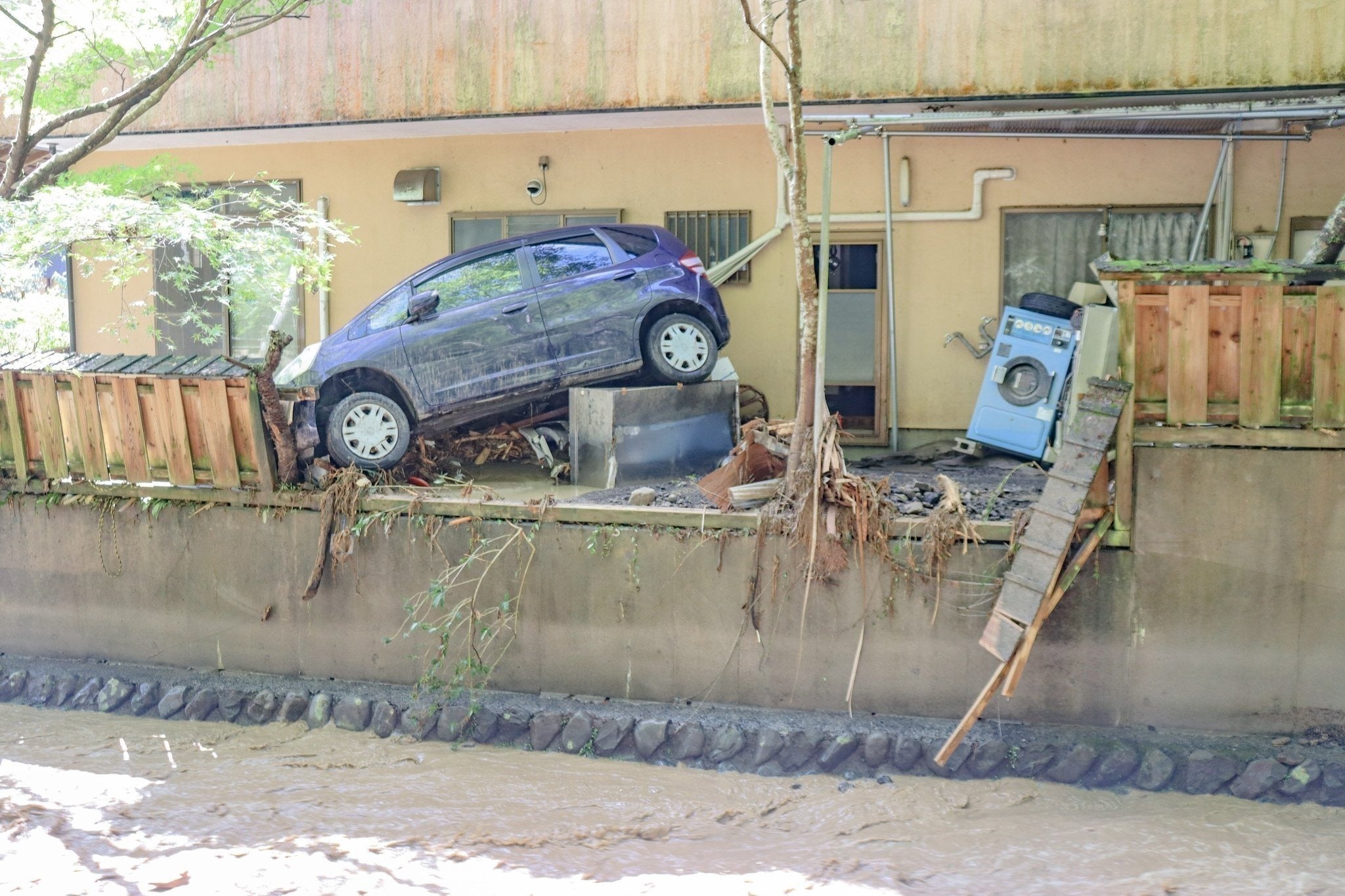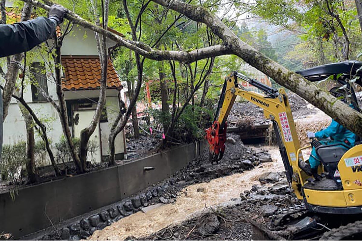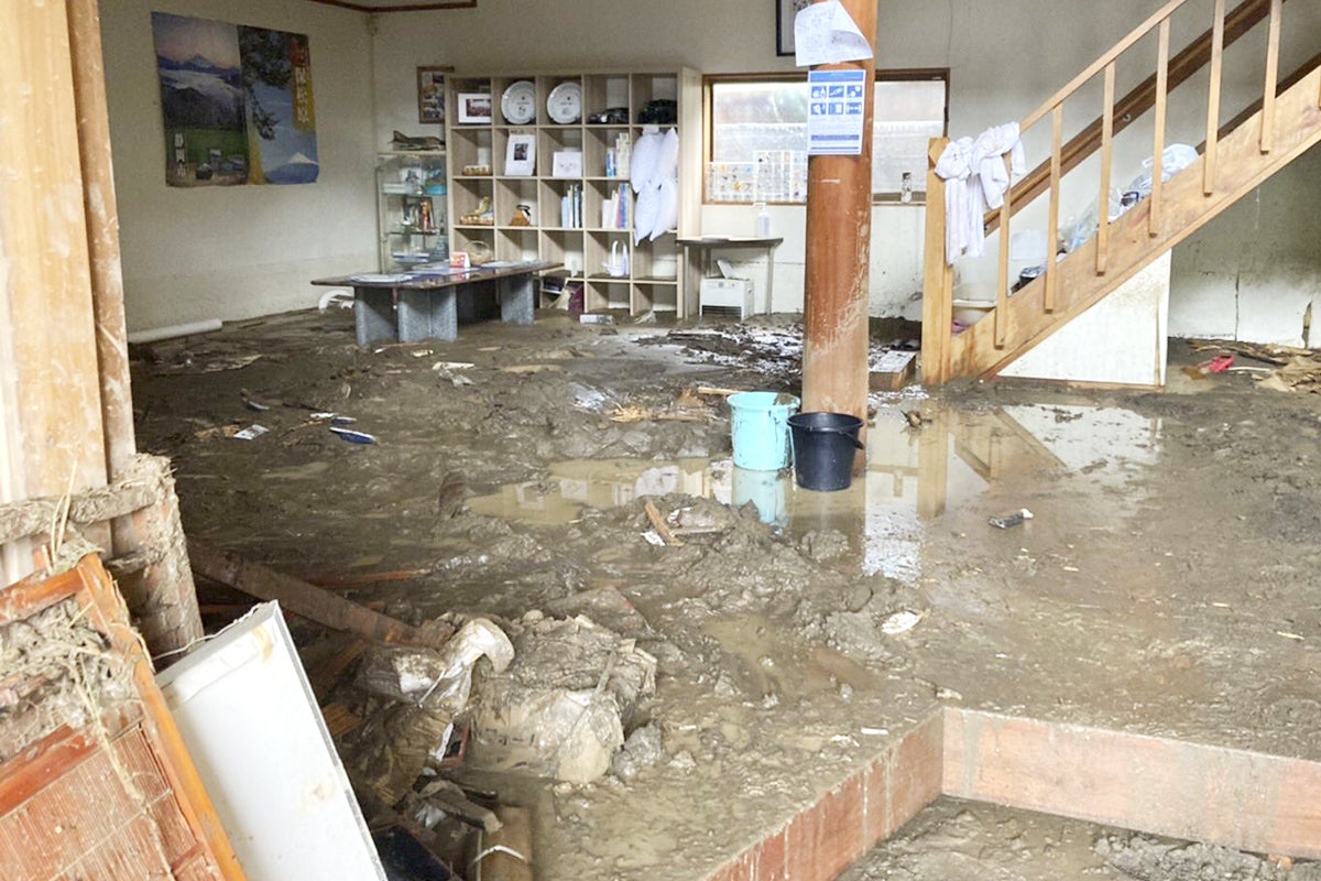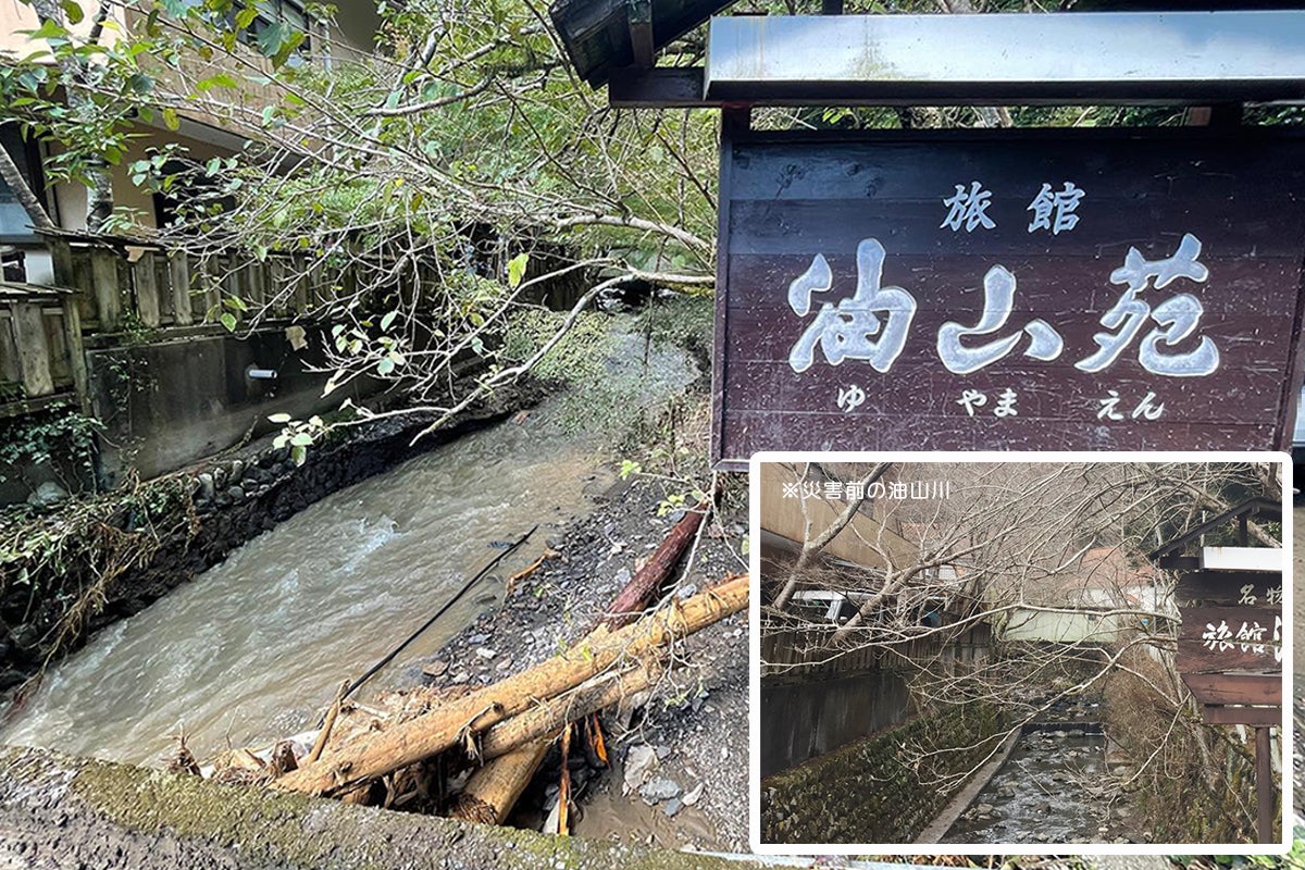 9月24日未明、奥の山の土砂崩れにより、油山苑の横を流れる油山川に大量の土砂が流れ込み氾濫、建物の扉を破って旅館1階部分に濁流が流れ込んでしまいました。
