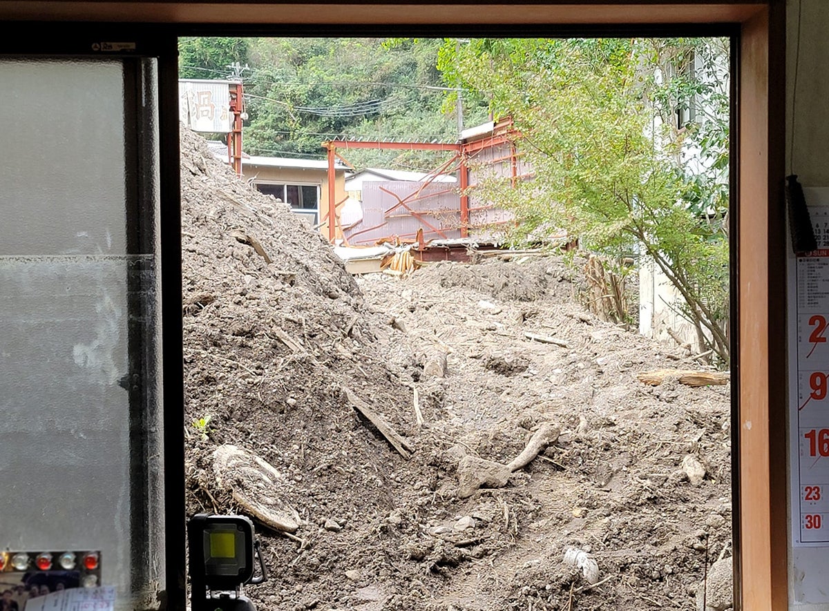 ロビー奥の窓をあけると、隣接地は大量の土砂で埋まっていました。(隣接建物自体は災害前より解体中)