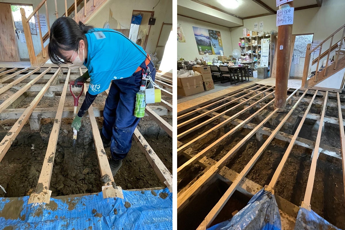 災害直後から2022年内は、浸水で使用できなくなった食器家具や機器などの処分、あらゆるところに残る泥の除去をボランティアの方々による人の力、重機の力で進める日々が続きました。