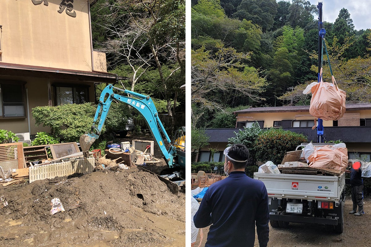 浸水してしまい使えなくなった家具や家電で宿の駐車場が埋まるほどの状況。これらをひとつひとつ処分しなければいけませんでした。トラックで何往復もして運び出しました。水を含んだ土砂は重く、重機も使っての除去作業となりました。
