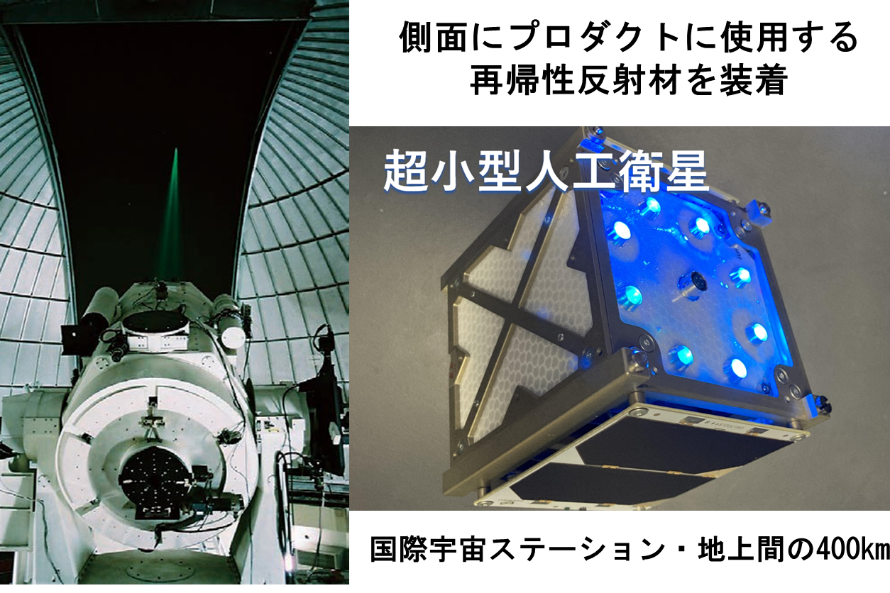 プロダクトの名称に「宇宙から光って見える」という言葉を加えました。その実証実験のために、右写真の超小型人工衛星「Space Tuna 1」の側面にプロダクトに使用する高輝度再帰性反射材を装着して、昨年の12月2日に国際宇宙ステーションの「きぼう」からの放出に成功しました。現在、地球400㎞上空を人工衛星として周回しています。この衛星に地上から左写真のレーザー照射設備を用いてレーザーを照射し、その反射特性を実測します。この高輝度再帰性反射材が本プロダクトに装着されています。