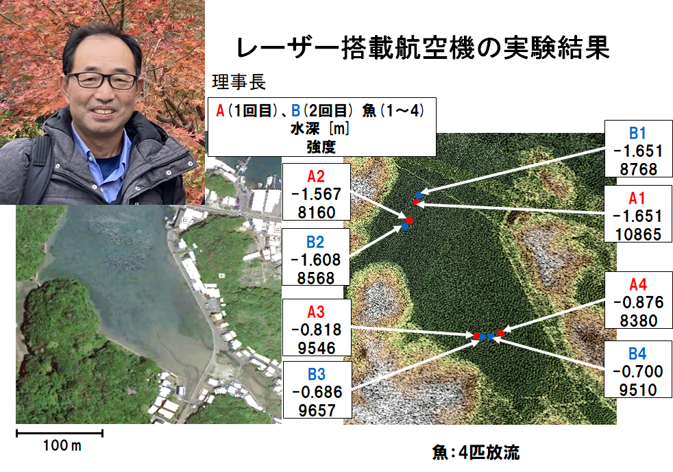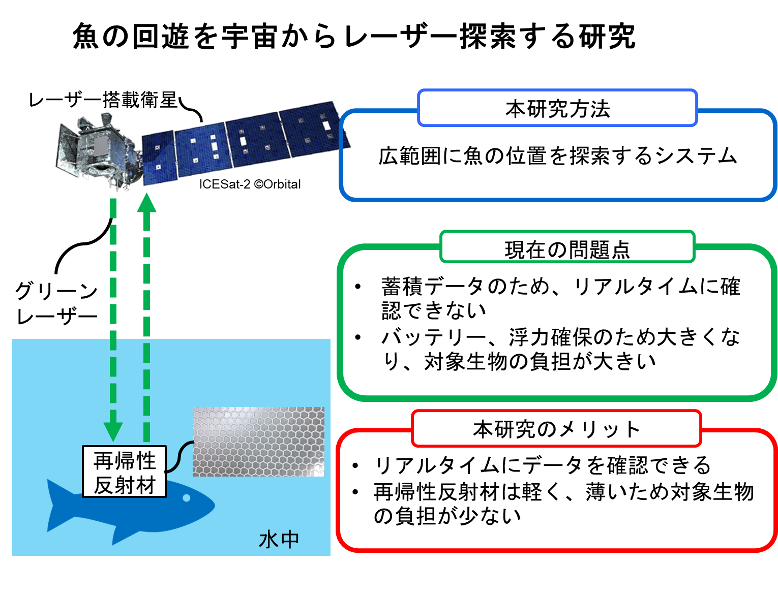 本プロジェクトの背景には、宇宙からマグロなどの回遊をレーザー探索で観測する研究があります。水中は電波が透過しませんが、グリーンレーザーはある程度透過します。実際に、500m上空からレーザー測距用の航空機で再帰性反射材を装着した魚の観測を実現しています。