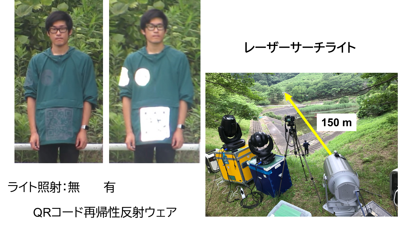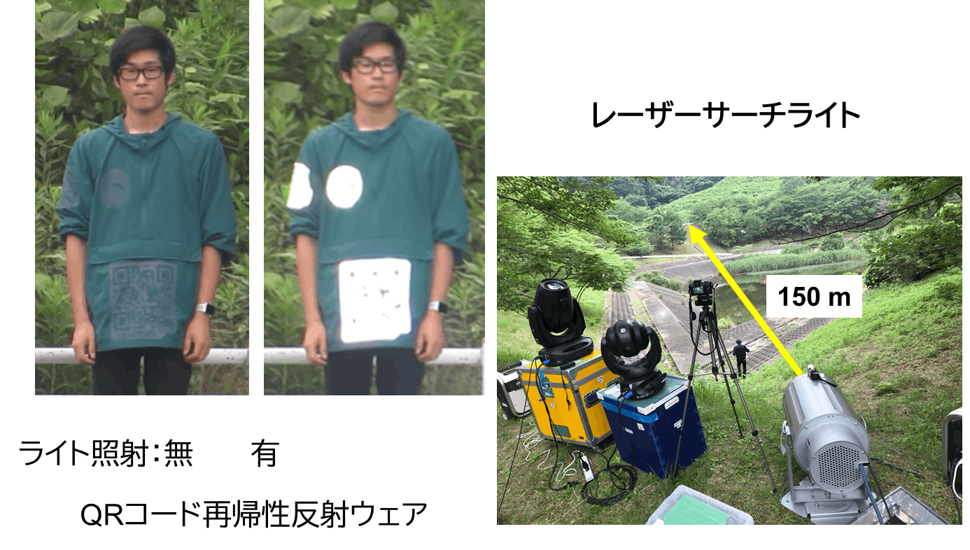 その後、本システムを山岳遭難者の捜索に利用できることがわかり、QRコード再帰性反射材をプリントしたウェアを開発し、下記のサーチライト搭載ドローンを用いた光探索システムの専用ソフトも開発しました。