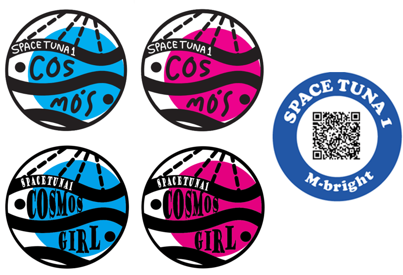 エンブレムのデザインは5種類です。素材は高輝度プリズム型再帰性反射材。直径6㎝、厚さ1㎜。エンブレム4種類は、宇宙好き女性団体のコスモ女子にオリジナルにデザインしてもらったコラボプロダクトです。可変QRコードのエンブレムは、あなたのオリジナルの写真やメッセージを自由に登録して何度でも書き換えをすることができます。