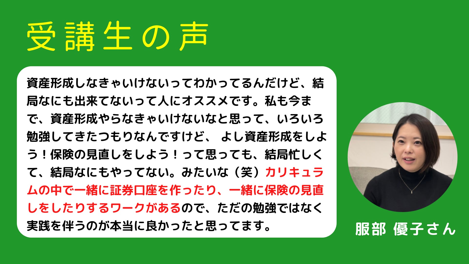 受講後は、保険の営業マンと対等に話し合うことができますし、たくさんの金融商品の中からご自身にとって適切な金融商品を選ぶことができます。払いすぎていた保険料・投資金額を見直すこともできるようになります。