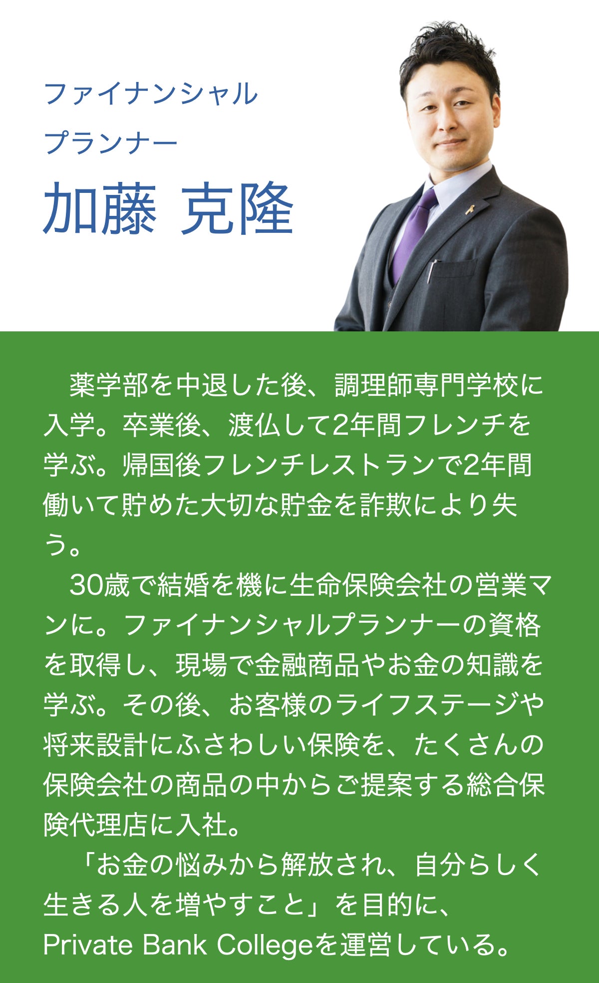 現在はiDeCoやNISAといった投資信託や生命保険、損害保険、少額短期保険といった幅広い金融商品を取り扱うファイナンシャルプランナー。保険会社からの表彰多数。生命保険募集人の1%以内といわれるMDRT会員。企業型確定拠出年金2020年度上期企業導入実績全国ナンバー1(SBIベネフィットシステムズ)。