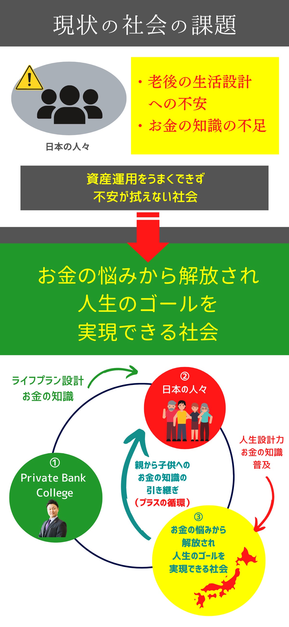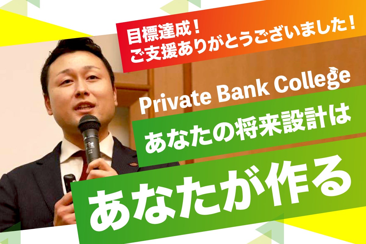 そこで私は、この状況を打破していくためにPrivate Bank Collegeを運営しております。「お金の悩みから解放され、人生のゴールを実現できる社会」を実現していきたいと思い、クラウドファンディングプロジェクトを立ち上げました!