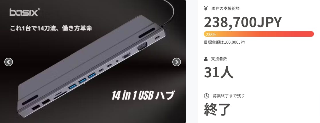 2023/06/11 09:0014 in 1 USBハブプロジェクトは、31名の支援者様のおかげで、目標に対し238%と大幅な達成率で終了することができました!誠にありがとうございます!メーカーとも密に連絡を取り合って、逐一情報を共有していたため、当初の予定よりかなり早く配送ができそうです。【ご支援いただいた31名の皆様へ】早速ですが、リターン商品の配送手続きを進めていきますので、お届け先の住所に間違いがないかどうか再度ご確認をお願いいたします。遅くとも7月中には配送が終了する予定なので、この間にご登録いただいている住所に変更が出る場合は、CAMPFIREのページからリターン送付先の住所をあらかじめ変更しておいてくださいますよう、ご協力お願い申し上げます。今後も動きがあり次第、逐一こちらの活動報告で報告させていただきます。この度は、誠にありがとうございました!ProgressiveMind一同 もっと見る