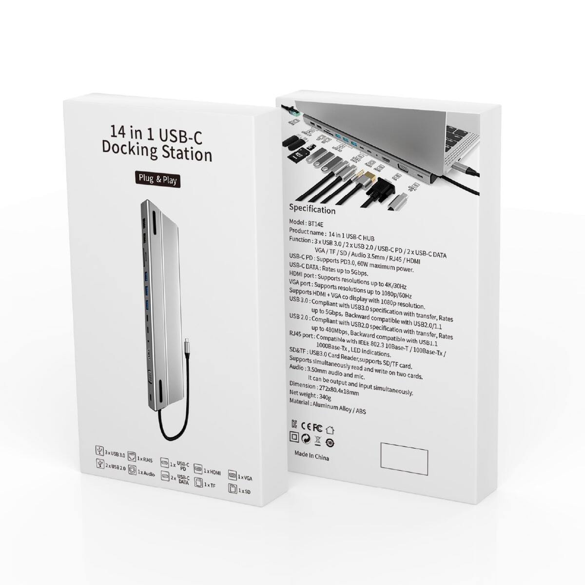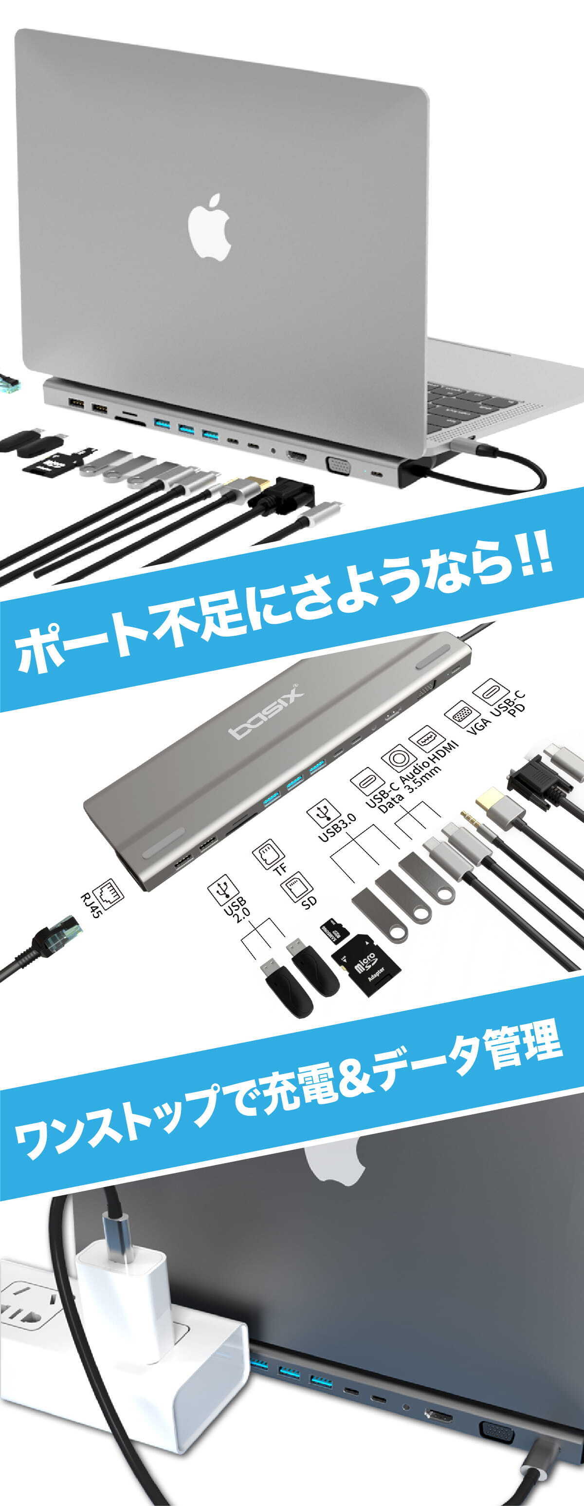 機能:USB 3.0ポート x 3/USB 2.0 ポート x 2/USB-C PD/USB-C Data x 2/VGA/TFカード/SDカード/オーディオジャック 3.5mm/RJ45/HDMI