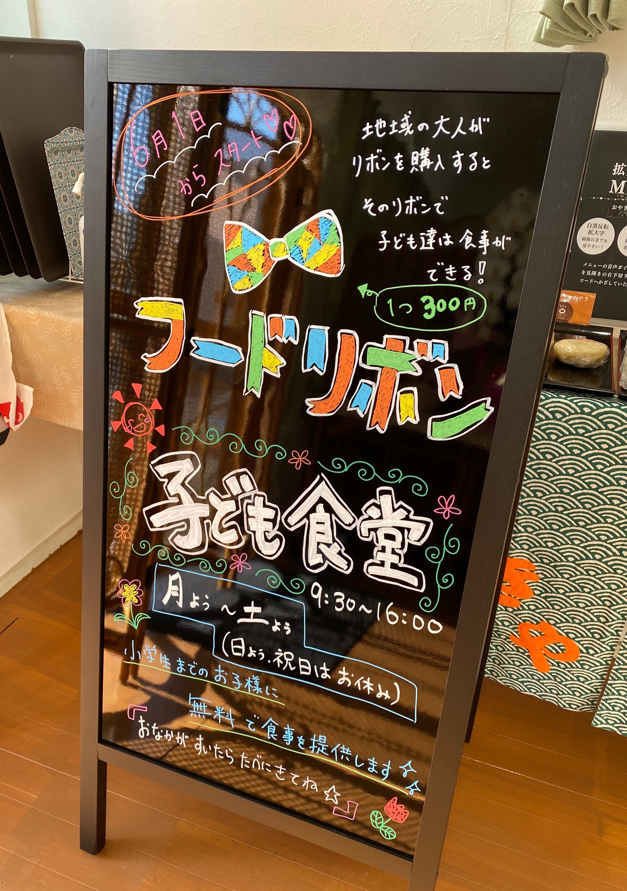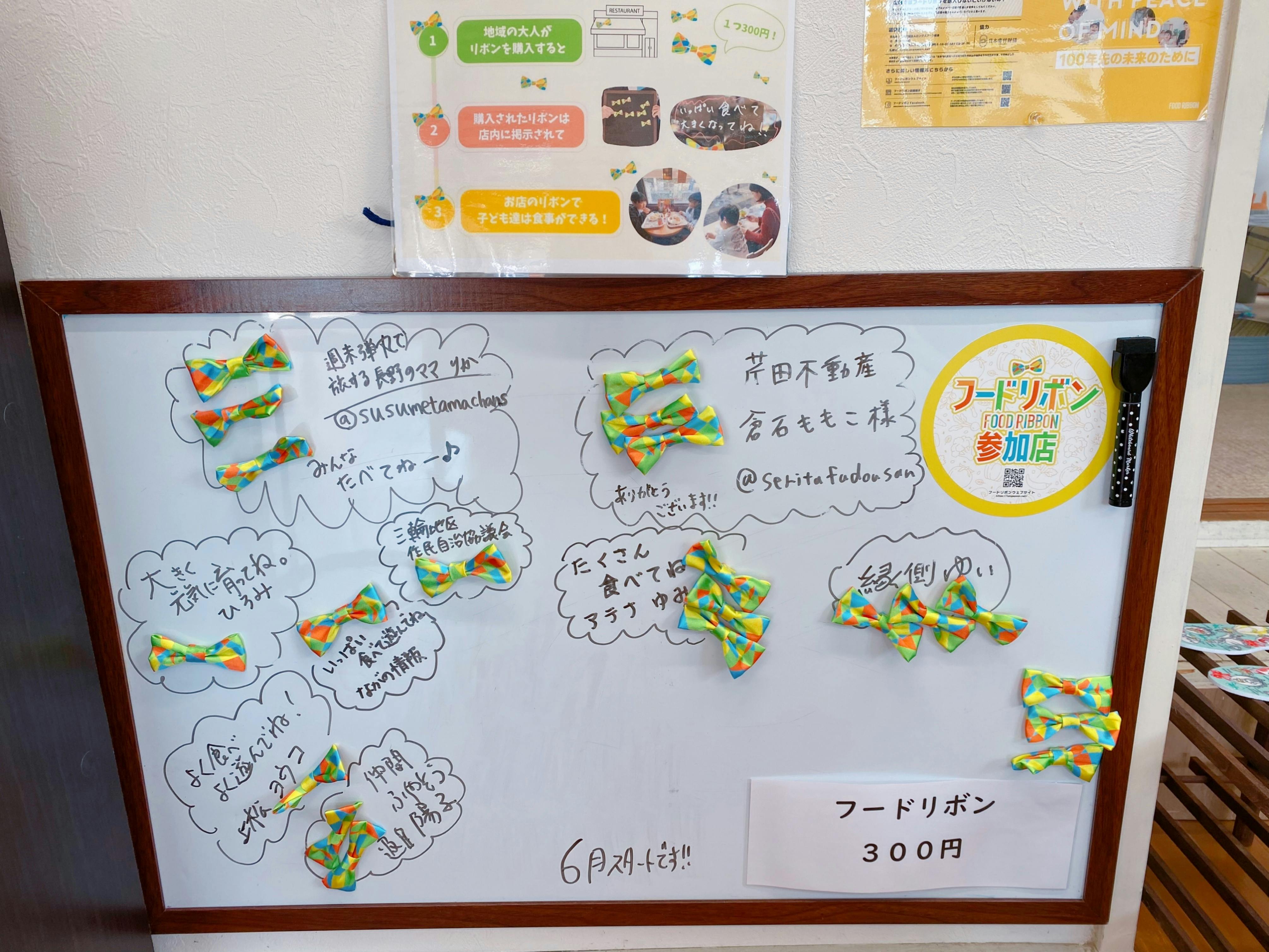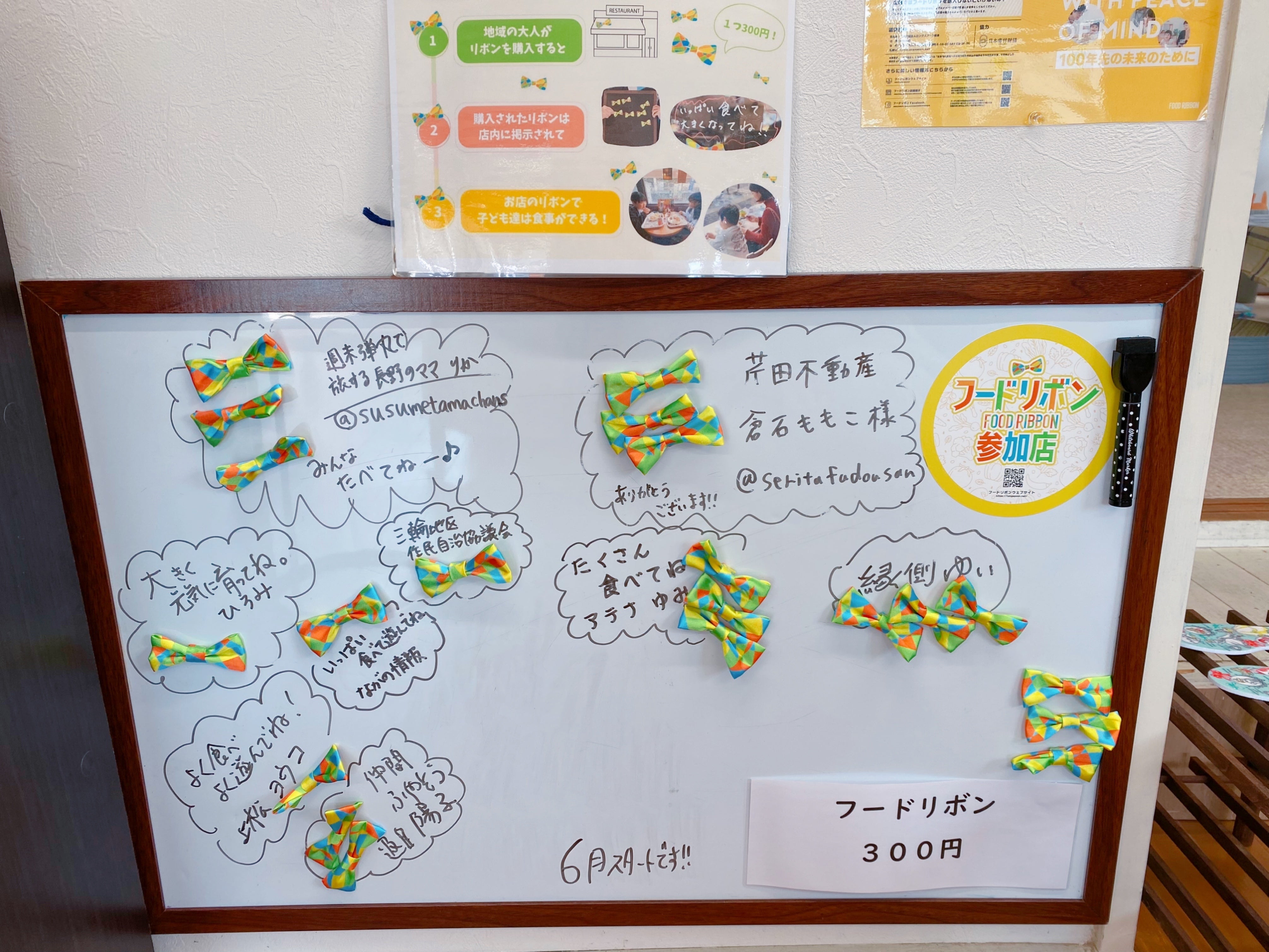 フードリボン現在21個。10名の支援者様ありがとうございます。ホワイトボードに支援者様のお名前メッセージと共に貼っております。地域の皆様が店の外に置いております、ブラックボードを見て『子ども食堂やるの?フードリボンってなに?』と興味を持ってくださり購入して下さいました。