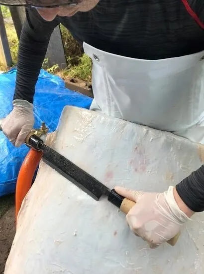 皮を鞣す前に、皮についている肉片、膜、脂などを取り除き