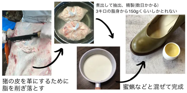 仕上げに塗っているレザーオイルは猪脂から手作りしています。