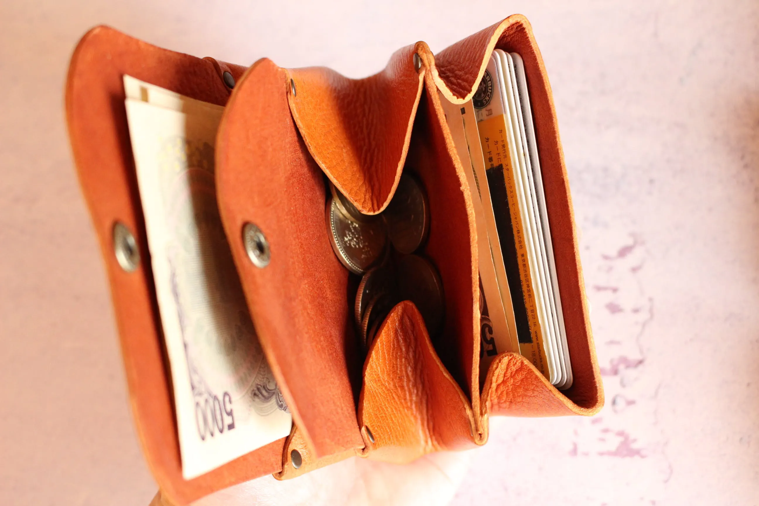 ・カード、コイン、お札を収納でき、手のひらに収まる超コンパクト設計。