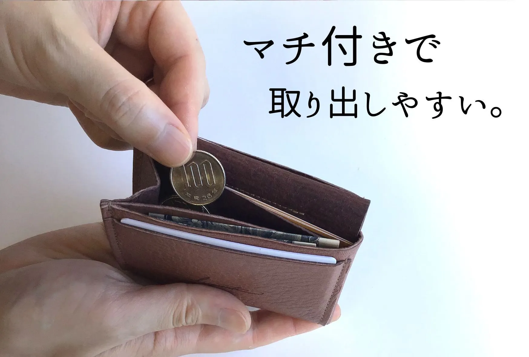 ・小銭入れは曲げるだけで取り出せる設計。広さがあり、スマートにお会計可能。