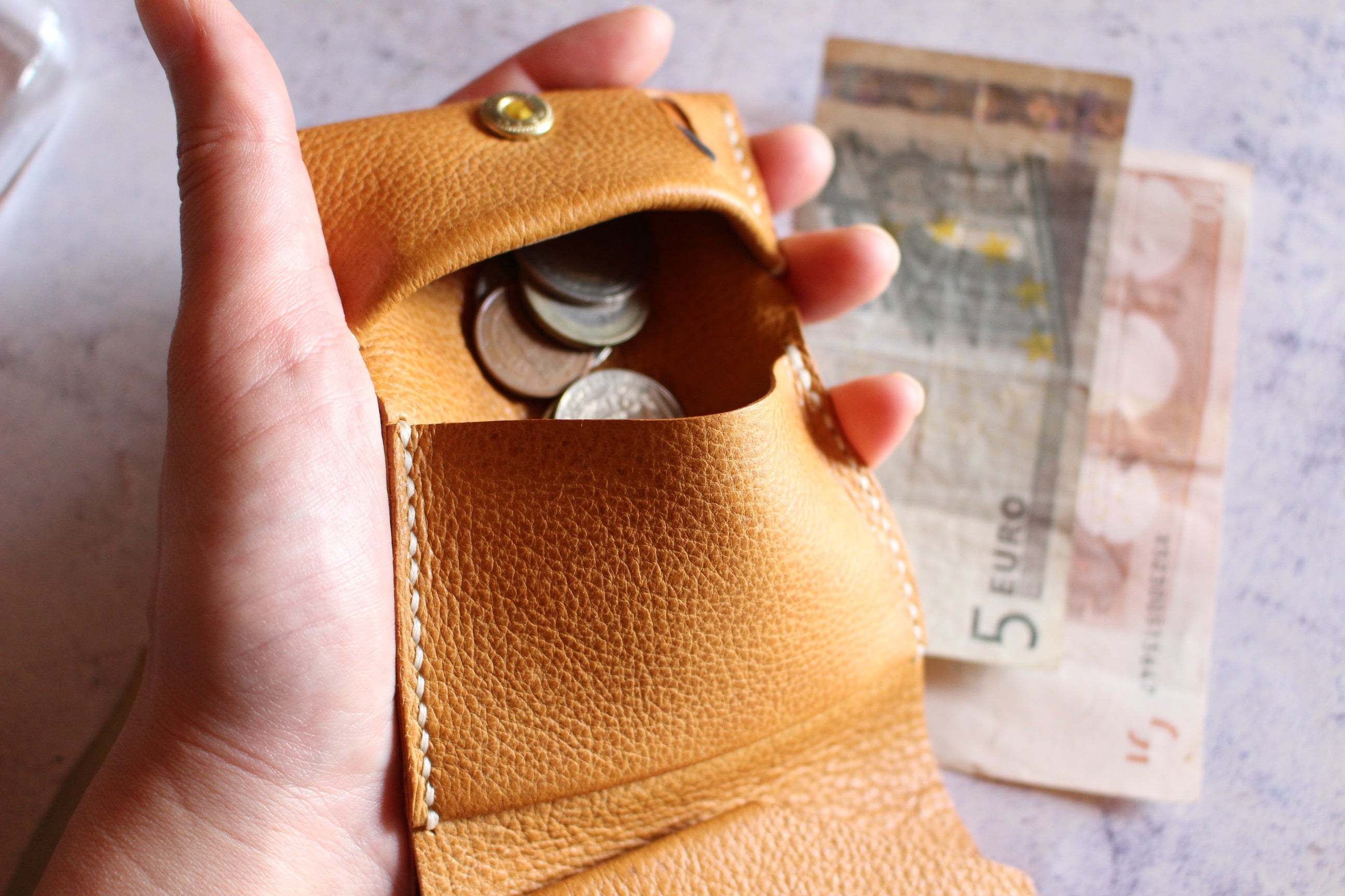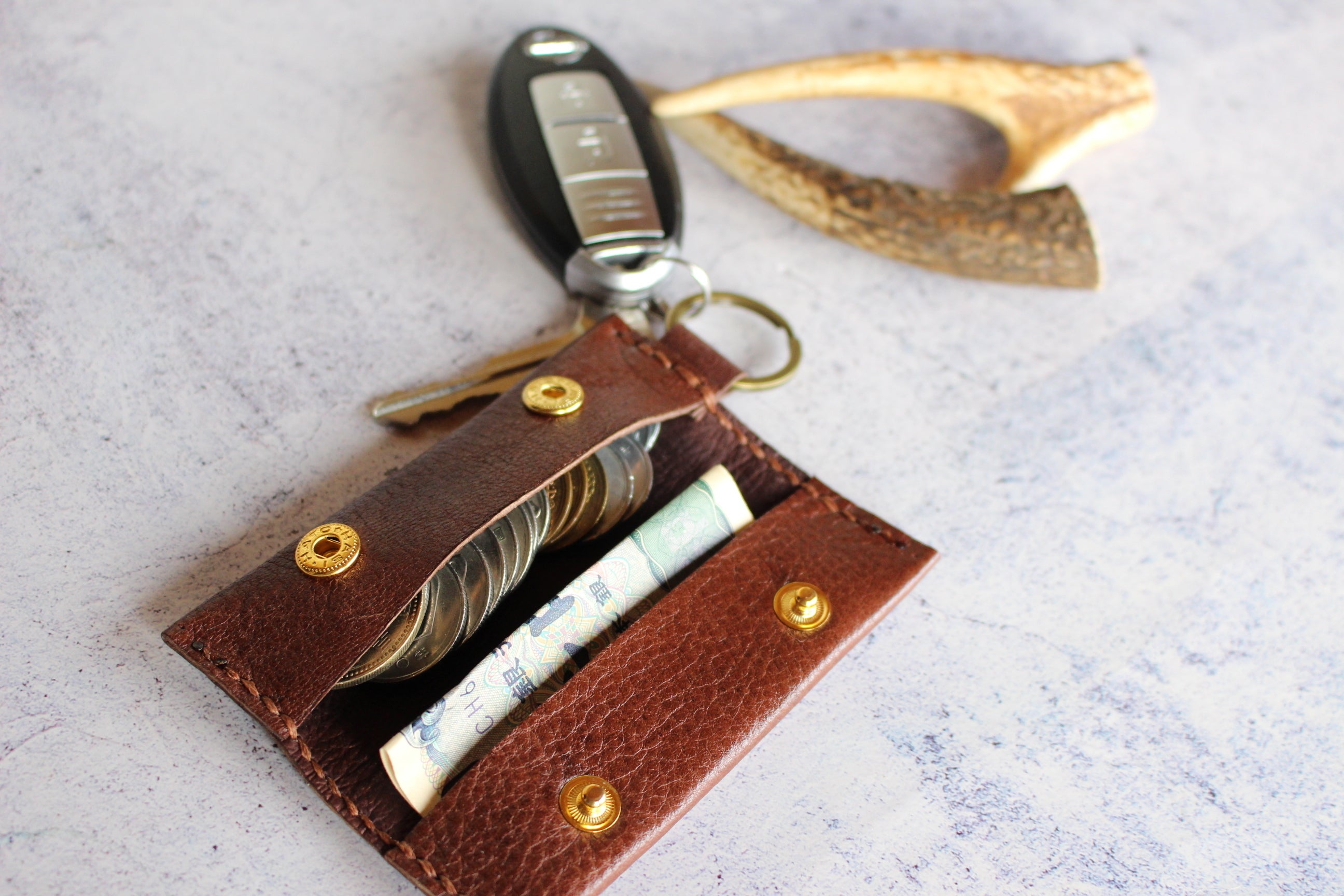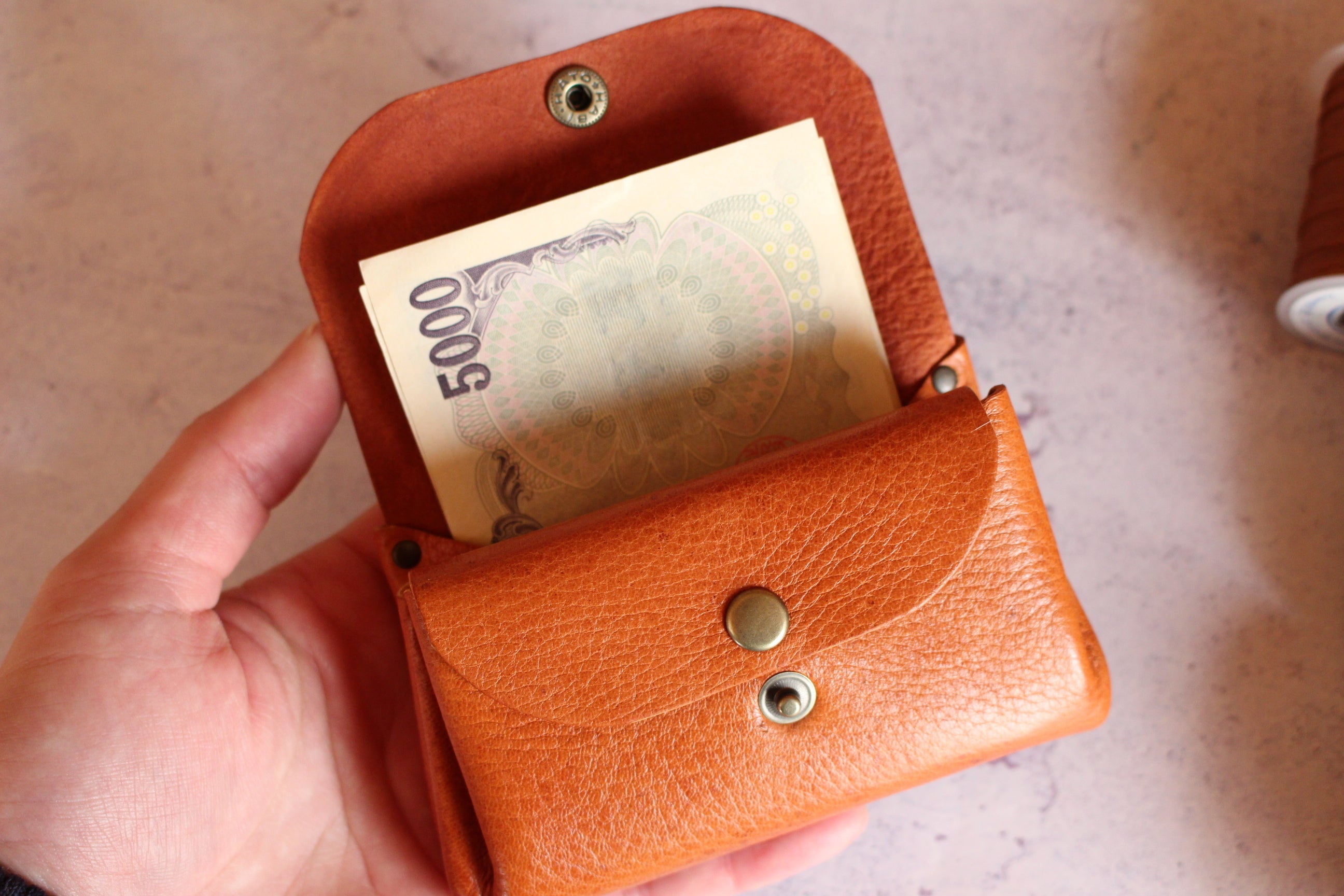 ・カード、コイン、お札を収納でき、手のひらに収まる超コンパクト設計。