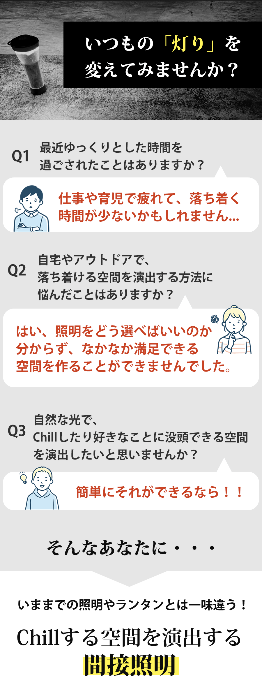 休日にはキャンプやハイキングなどを趣味として楽しんでいました。しかし、友人らとキャンプに行くときには、通常のランタンやフラッシュライトを使用していましたが、その光は強く、落ち着いた雰囲気を壊してしまい、周りの自然に悪影響を与えることになるため、使いづらさを感じていました。