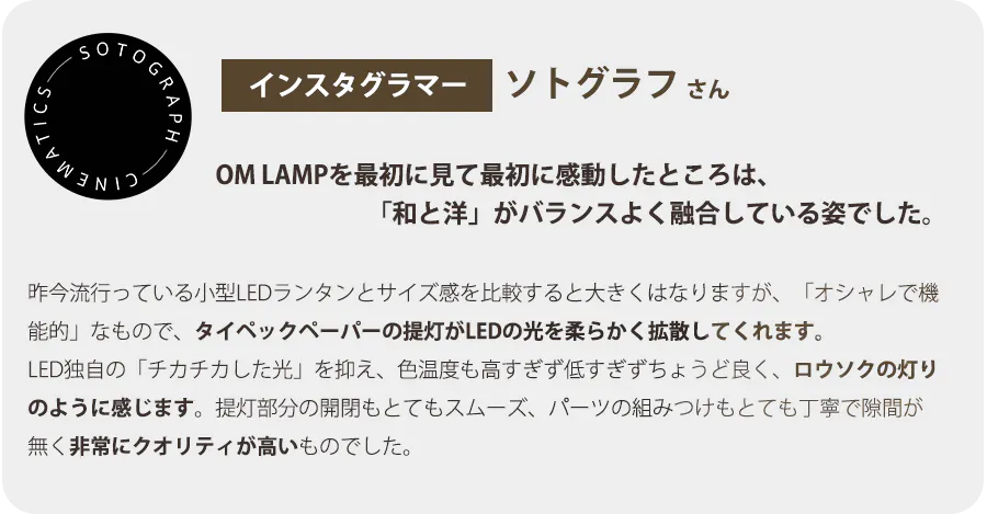 そこで、私はキャンプやアウトドアでも美しく、落ち着いた雰囲気を壊さない照明を求め、OMLAMPの開発を始めました。和の美学を取り入れ、360度に光を放ち、優しい光を灯す照明を開発することを決めました。
