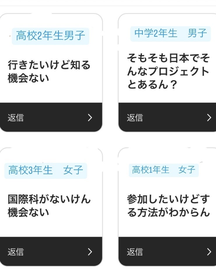 また、普通科のみの高校ではほとんど国際交流の機会がないことが改めて分かりました。そのため、国際交流のプログラムをひとまとめにして、誰でもそのサイトをみれば今行われている国際プログラムが分かるサイトを運営するつもりです!また、国際科がない学校とある学校の差を無くすように日本と海外の学校を定期的に繋げれるような取り組みもしたいと考えてます