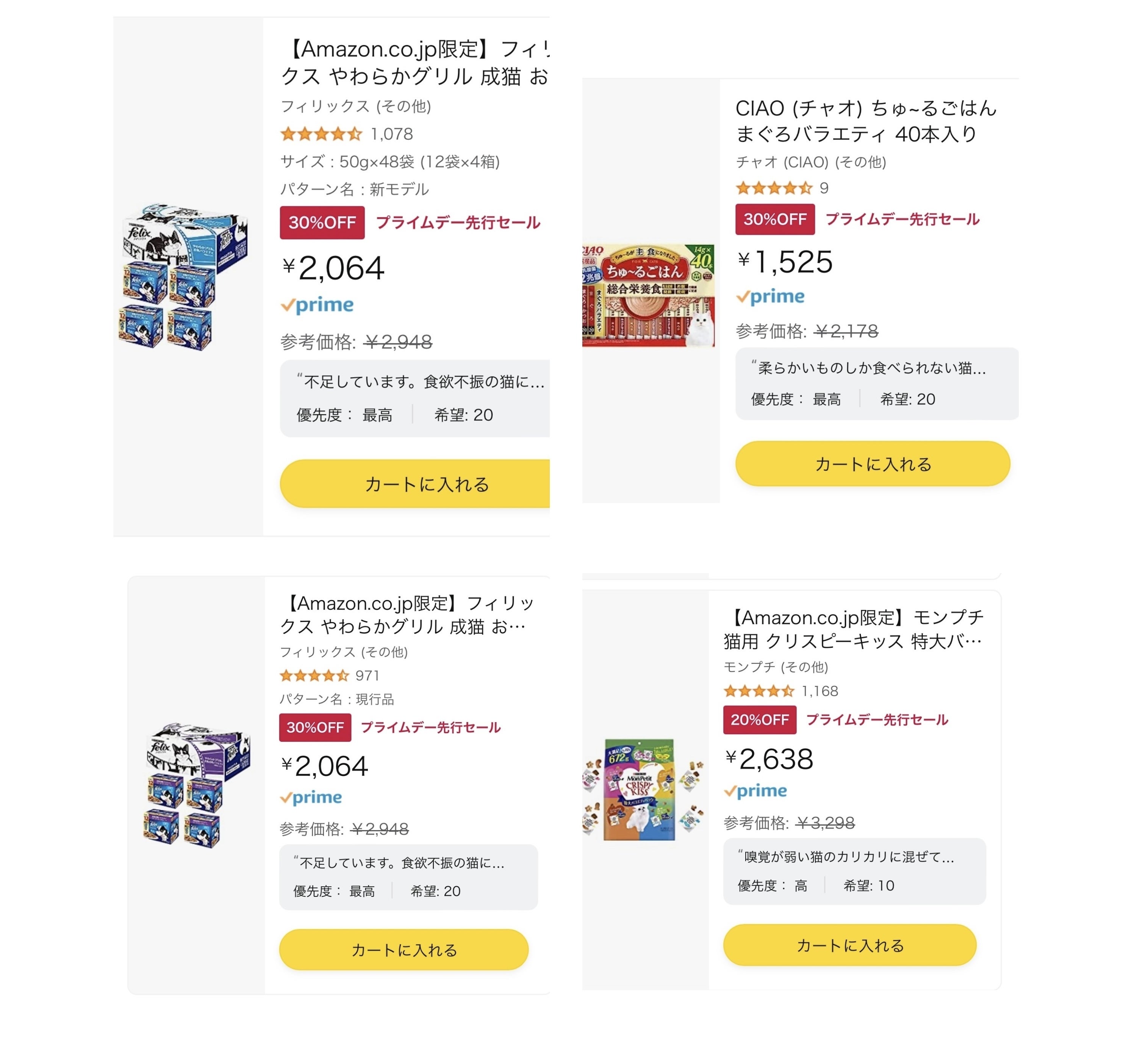 インスタグラムでもご協力をお願いしたのですが、猫達のフードが現在Amazonのプライムセール中です。