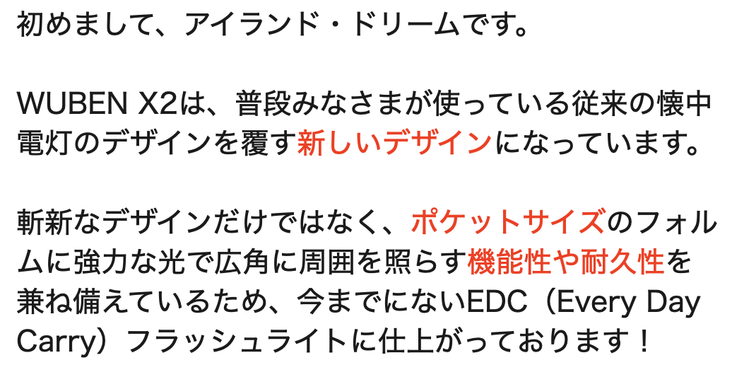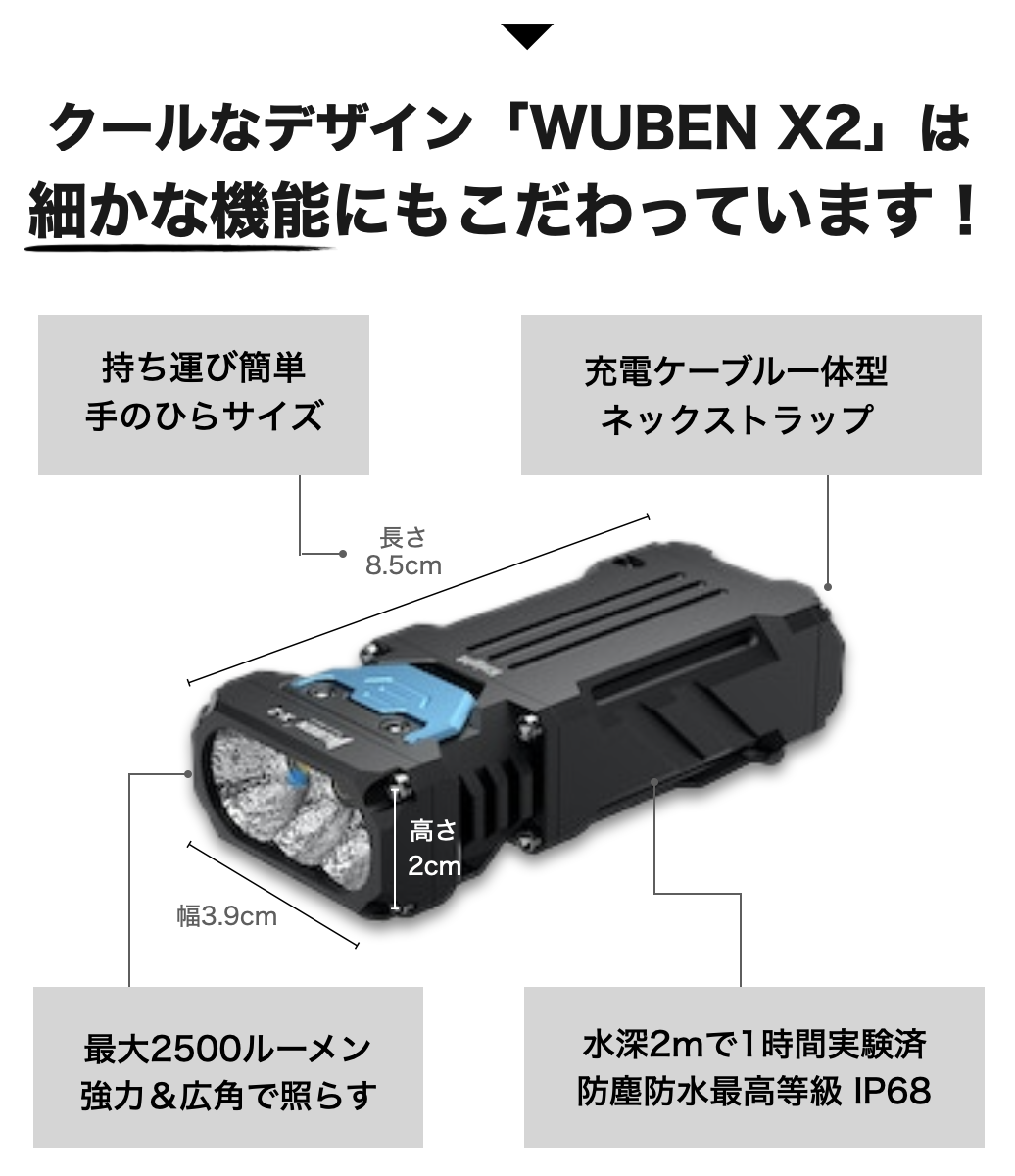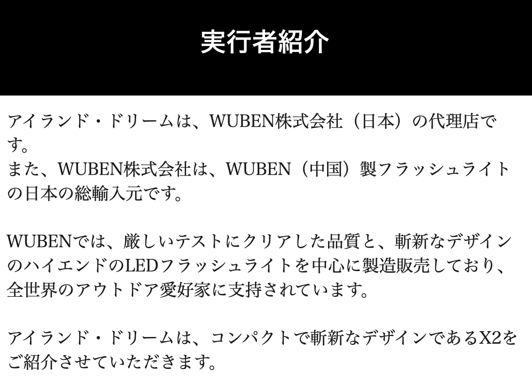 ※アイランド・ドリームはWUBEN「X2」の正規代理店です。 並行輸入品が発生する可能性がございますが、並行輸入品には正規代理店による製品サポートを受けることができません。また、正規代理店を通じて購入することで、日本国内での流通に必要な各種認証の取得や、関税の適切な処理が担保されます。
