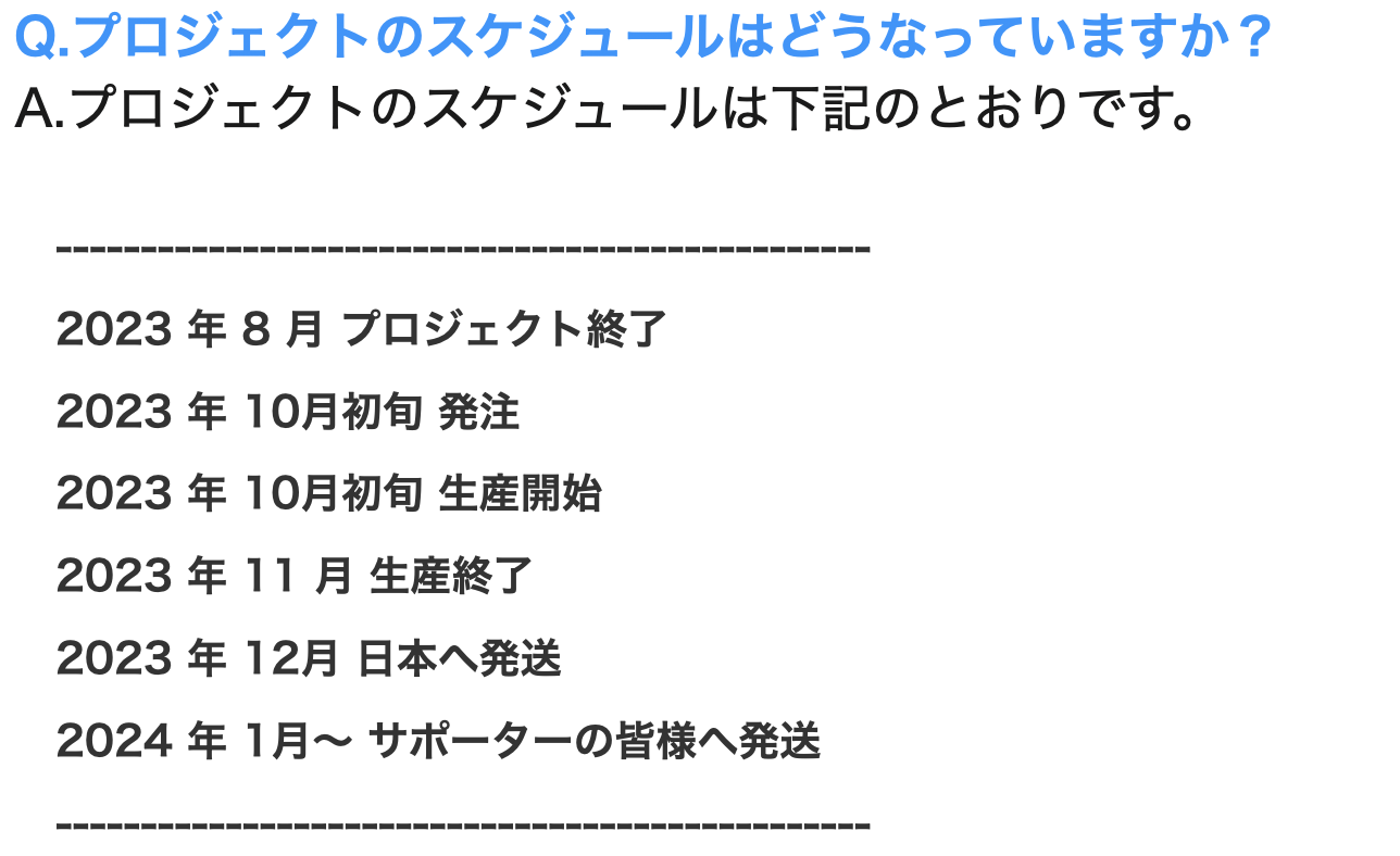 ※本文中に記載させていただいたスケジュールは、あくまでプロジェクト公開時点の予定です。支援購入の性質上、配送遅延のおそれがございます。