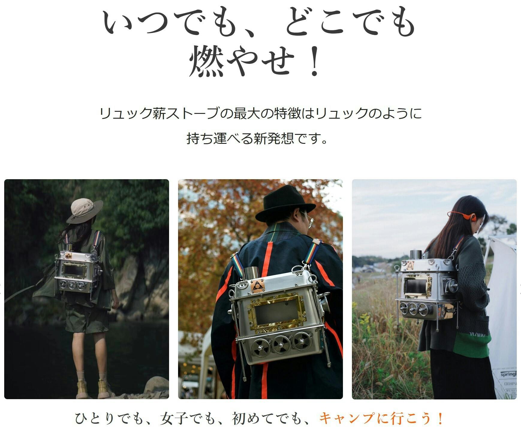 私たちの製品は、携帯性と機能性を兼ね備えた薪ストーブです。背負って運べるリュック型デザインと、レトロでスチームパンクな雰囲気が特徴で、焼き色が美しい独特の仕上がりが自慢です。そして使用するたびに、ステンレス鋼の外壁は炎の色によって彩られ、まるで彩色の星空のような美しさを放つのです。その魅力は使い始めてからも絶えません。使用する度に独特の焼き色が生まれ、まるで育てる楽しみを提供します。