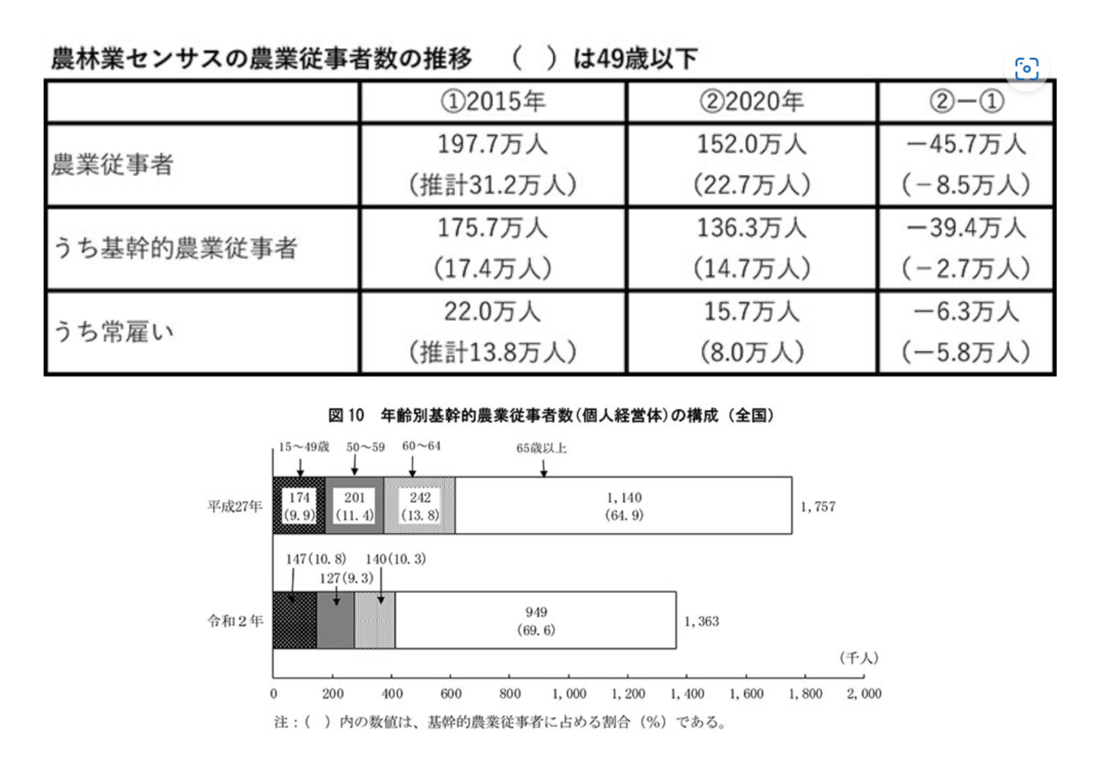 基幹的農業従事者は136.3万人で、5年間で39.4万人減少しました。高齢化でリタイアが進んだとみられています。49歳以下は14.7万人で2.7万人減少しました。農業従事者の減少は深刻な問題です。※農業協同組合新聞より
