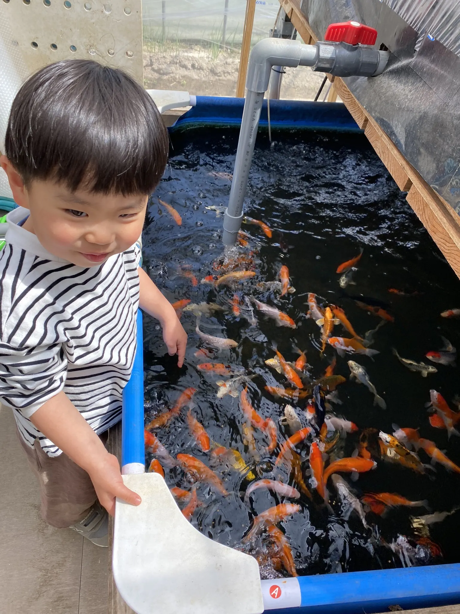 息子と一緒にアクアポニックスの餌やりを行いました。いつも興味津々で、魚たちにエサを与えてくれました。