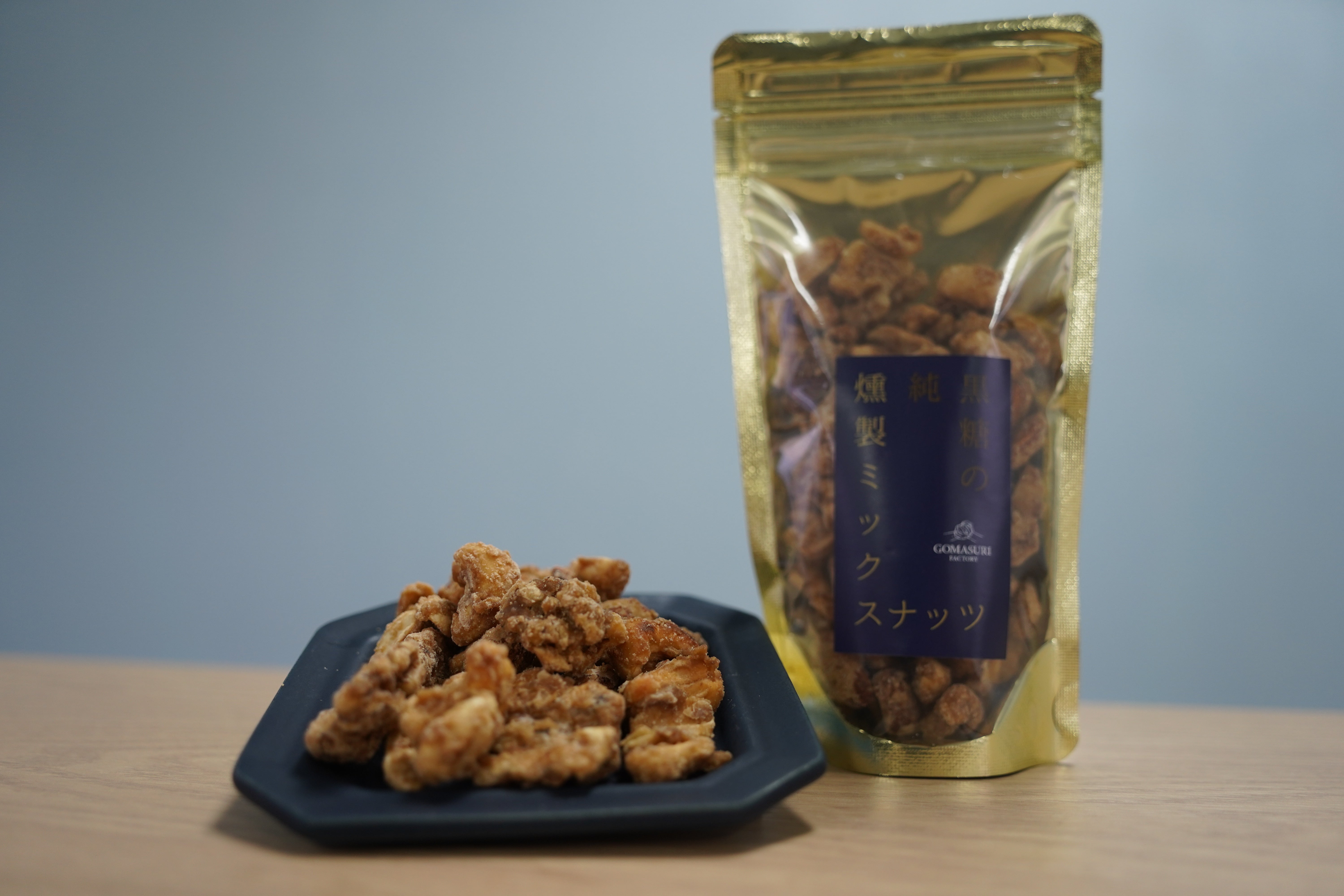 口の中に含んだ瞬間に広がる優しい甘さの純黒糖と燻製されたナッツの相性が抜群の逸品です。おつまみにもおやつにもおすすめです。