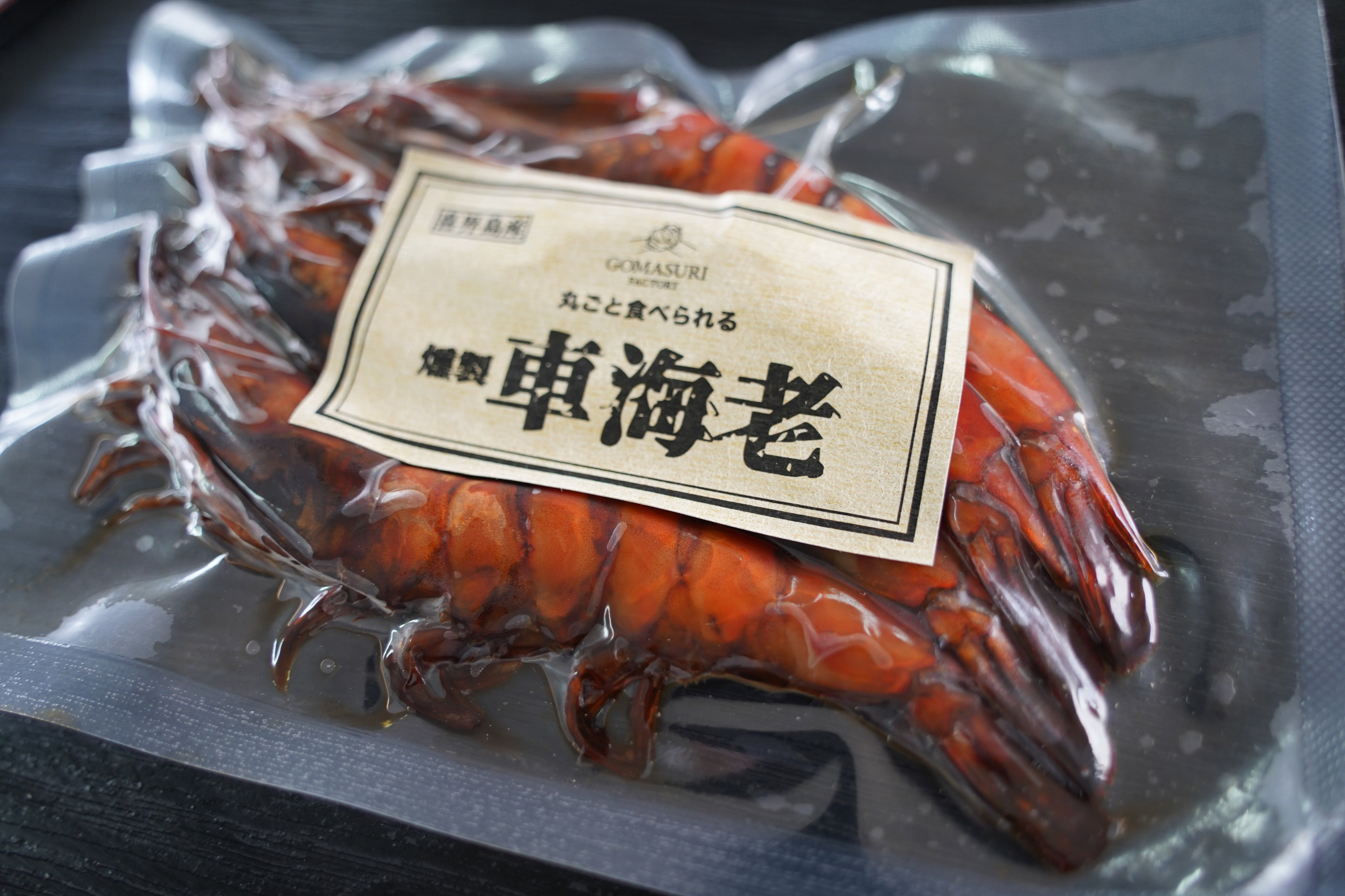 12月の販売開始から即完売してしまった商品が、喜界島産車海老の燻製です。この燻製車海老は、東京銀座の高級寿司店でも提供されている喜界島産車海老を贅沢に丸ごと燻製にした大人のおつまみです。