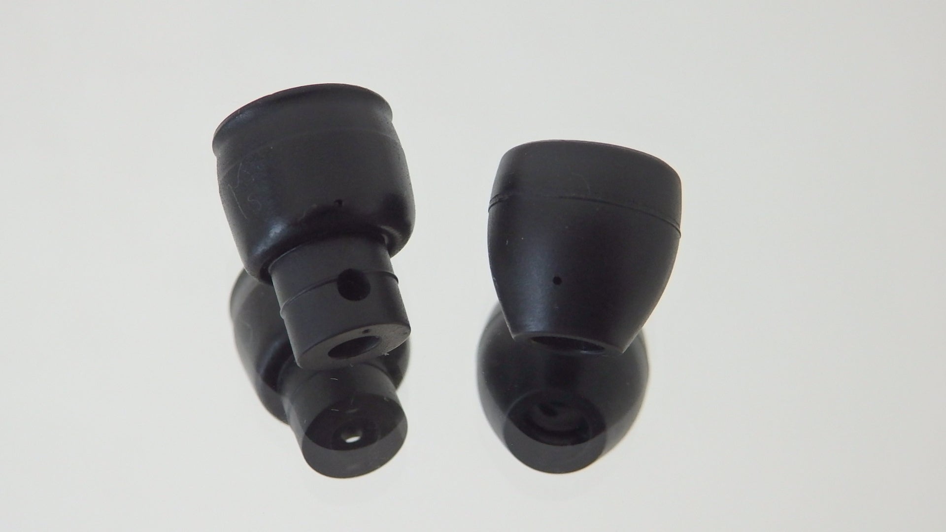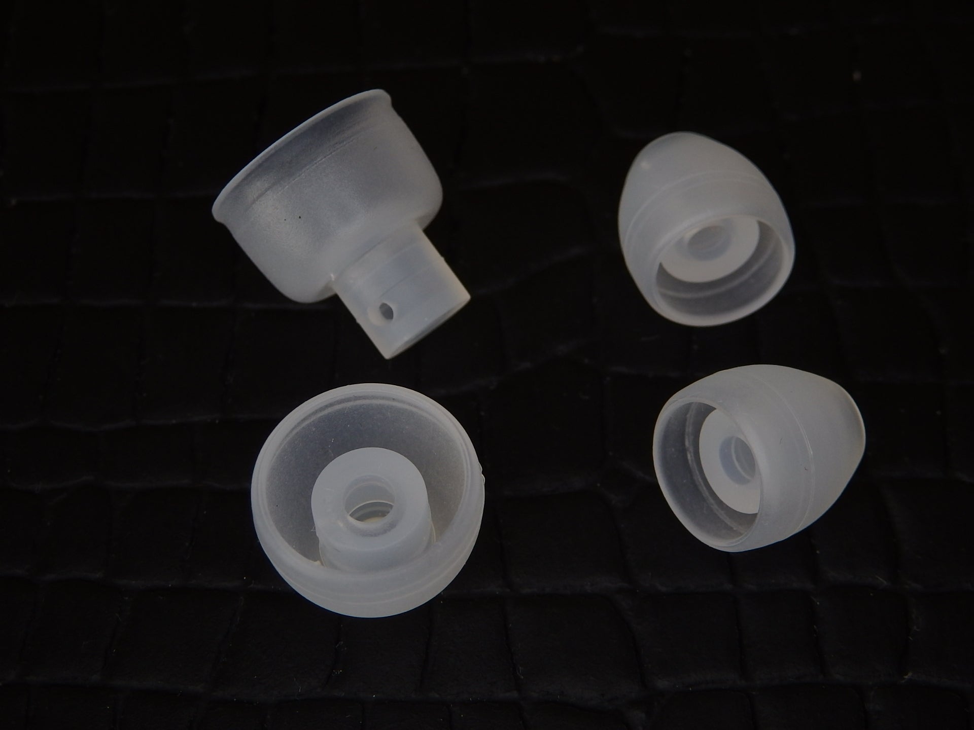 ・イヤホン側から先端に行くに従い放物線の様に外径を変化させ厚みを薄くする事で成立しており、カップ先端は若干巻き込む様にし外耳への挿入性を高めています。通常のイヤーピースでは逆さに入れると、座屈し機能しない事もあります。