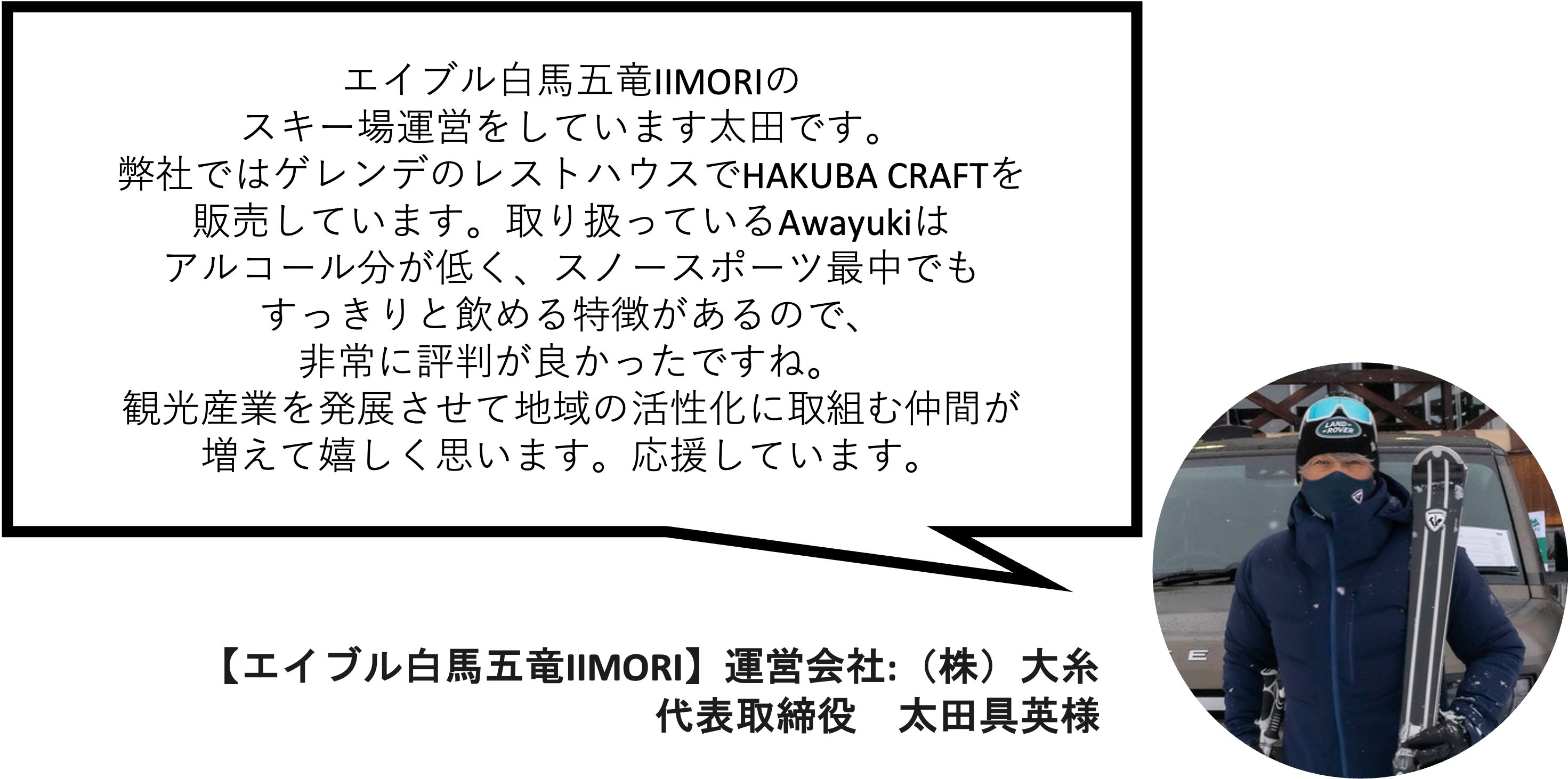 まずは私たちが地元愛にあふれていることを知ってもらう。次にクラフトビールを好きになってもらう。そして“白馬”、“HAKUBA CRAFT”のファンになってもらう。そのためになるべくお客様と直接話せて、小回りを効かせられる地元での販売にこだわってきました。