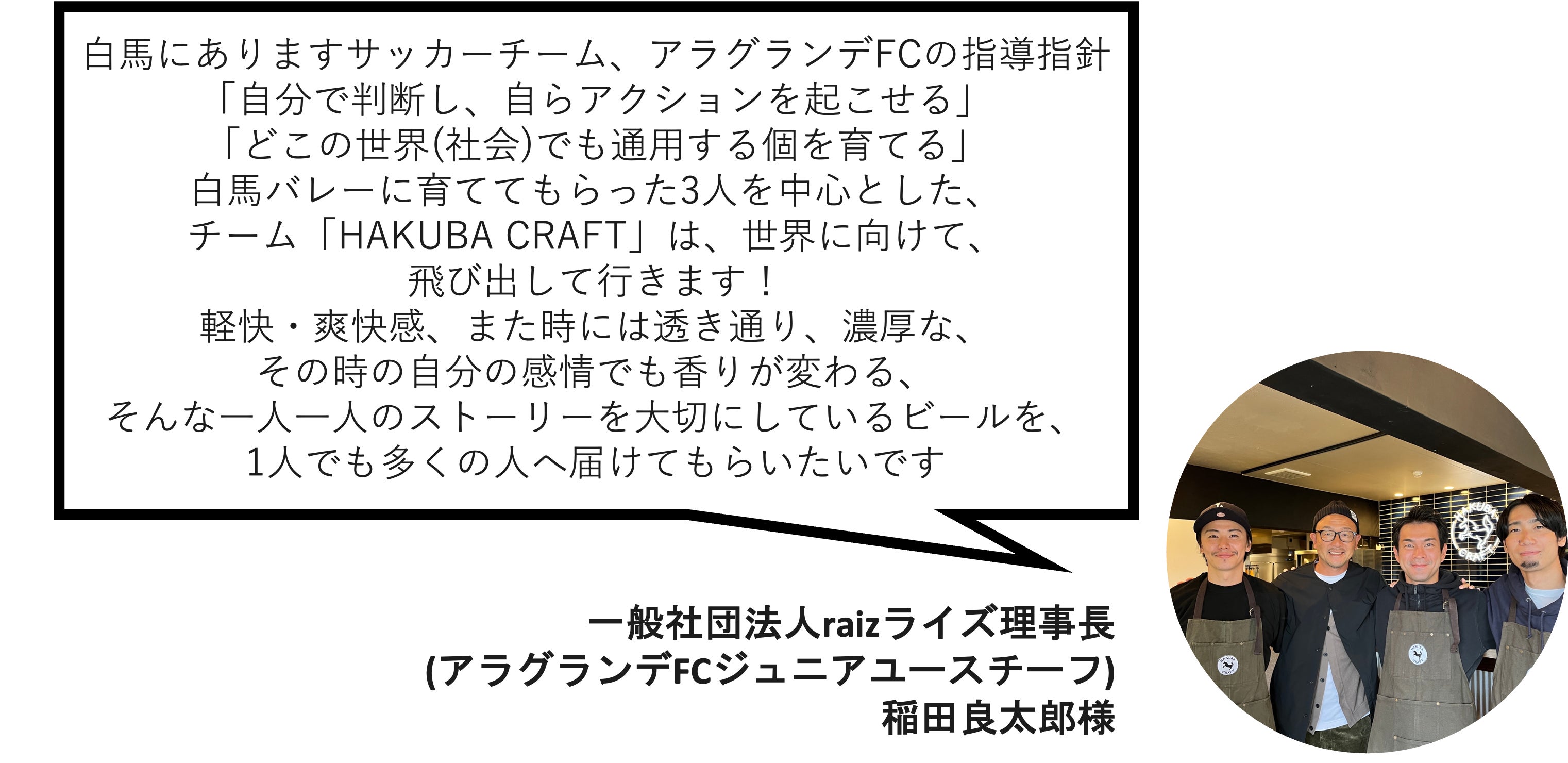 “白馬バレー”(以下:白馬)の新しい魅力となるクラフトビールを生産して、クラフトビールをきっかけに、白馬を知ってもらい、訪れてもらい、満喫してもらう。(住んでもらう)そして、何度も訪れたくなるような、自身の故郷と感じてもらいたい。そんな、人々にとって愛着のある場所になっていくことの一助を担うことを目指しています。