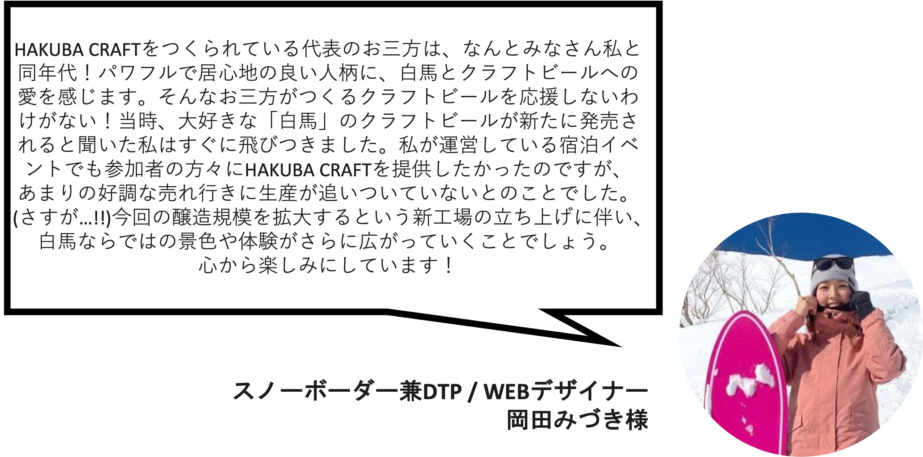 そして私たちは決意しました。まずは楽しみにしていただいているお客様への安定供給をお約束するために生産能力を高めます。さらに、全国・世界中の人々が“HAKUBA CRAFT”を手に取り“白馬”を知ってもらうために生産能力を高めます。