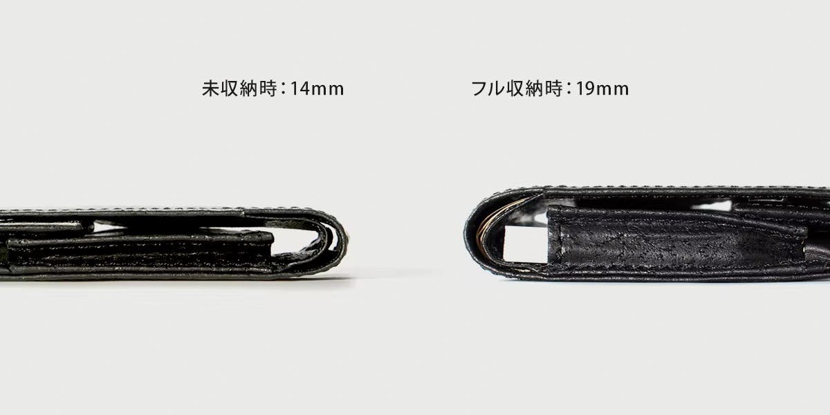 カード10枚、コイン16枚、紙幣10枚を入れても19mm。パンツの前ポケットや、シャツのポケットに入れてももたつきません。