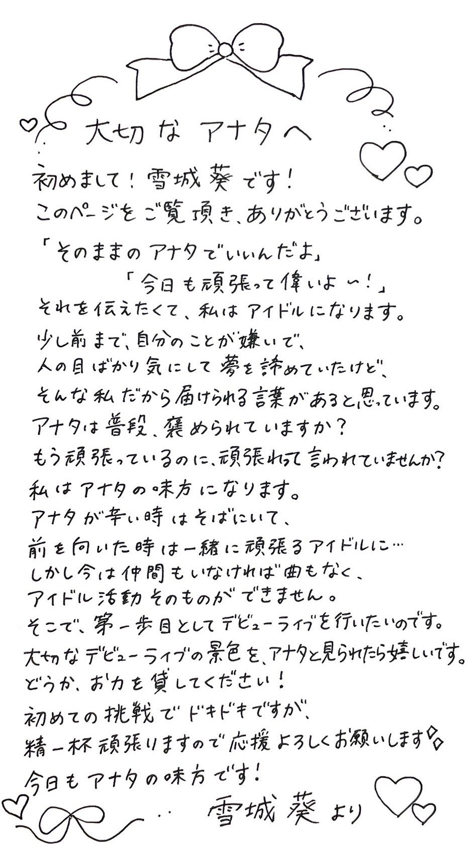 私がどうしてアイドルになりたいのか、どんなアイドルになりたいのか、どんなアイドルグループをつくりたいのか……そんな話を読んでもらえるととってもうれしいです。